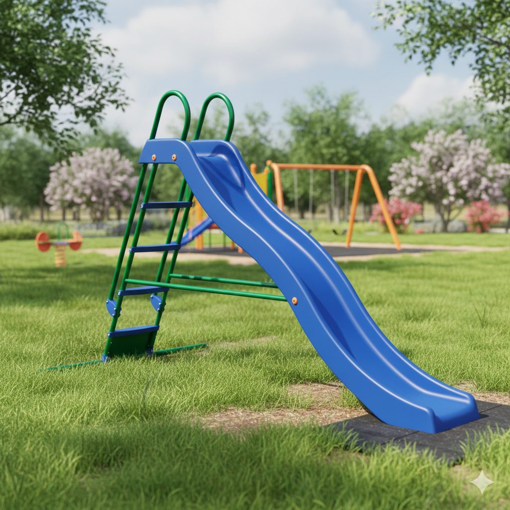- Lo scivolo per bambini è realizzato in metallo blu e verde ed è composto da cinque gradini in plastica resistente