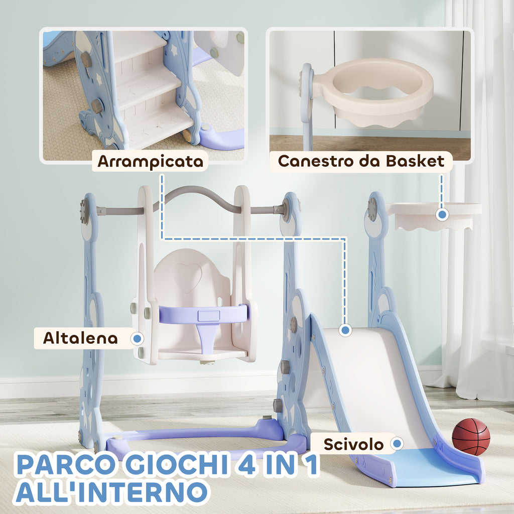 Scivolo per Bambini 4 in 1 con Altalena Canestro Arrampicata 147,5x160x107 cm Azzurro Chiaro
