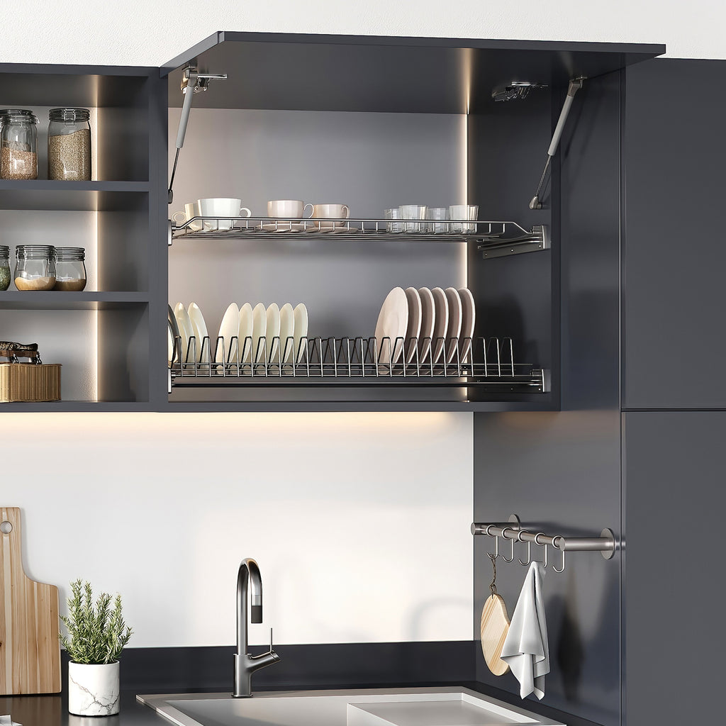 Lo scolapiatti Suprastar è progettato per organizzare le stoviglie negli armadietti della cucina. Ha un ripiano per i bicchieri e un altro per i piatti, con un vassoio di raccolta che impedisce all'acqua di danneggiare i mobili.