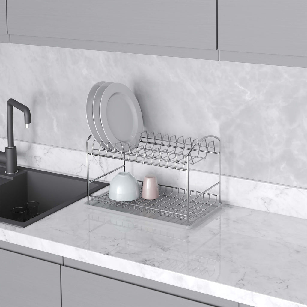Scolapiatti con due ripiani e gocciolatoio fabbricato in acciaio e con vassoio in plastica. Migliora e ottimizza l'organizzazione di piatti e bicchieri in cucina. Nessuna installazione richiesta.