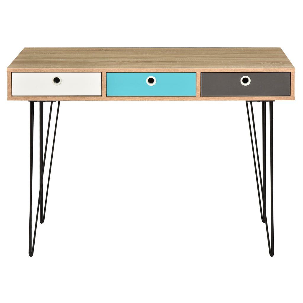 - STILE NORDICO: Questo scrivania compatta con color rovere chiaro e gambe in nero, porta la tua casa eleganza. 3 cassetti: in bainco, grigio, verde, molto attraenti.