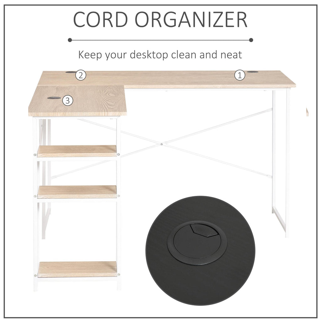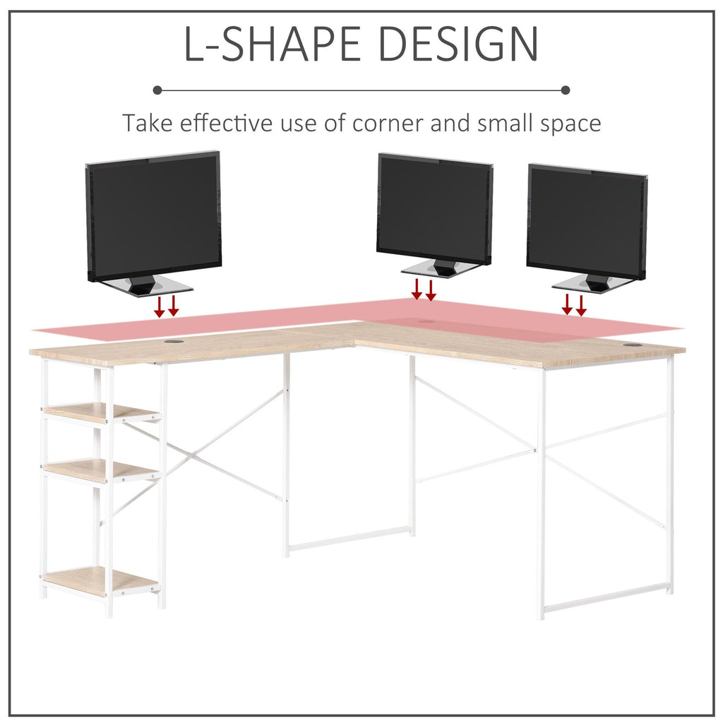 Scrivania Angolare da Ufficio 150x120x74 cm con 3 Mensole in Metallo e MDF Legno e Bianco