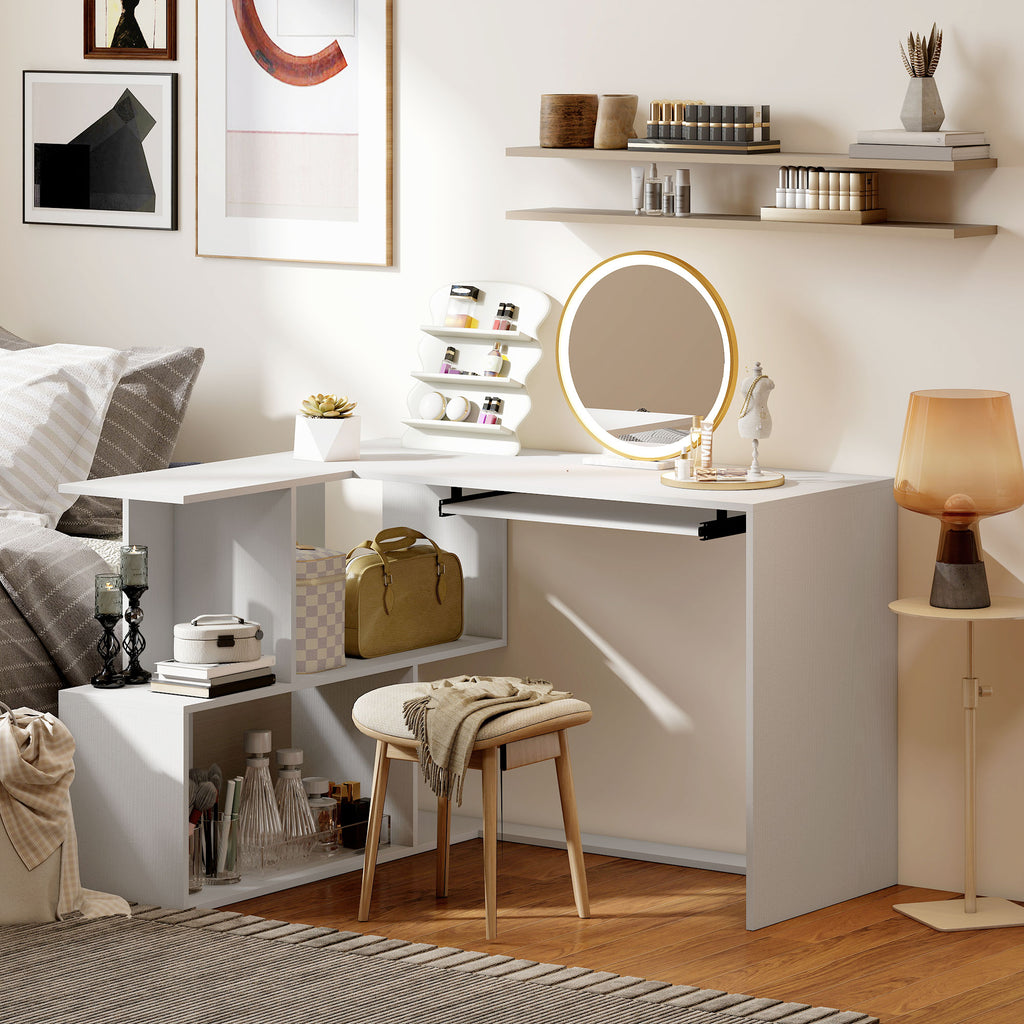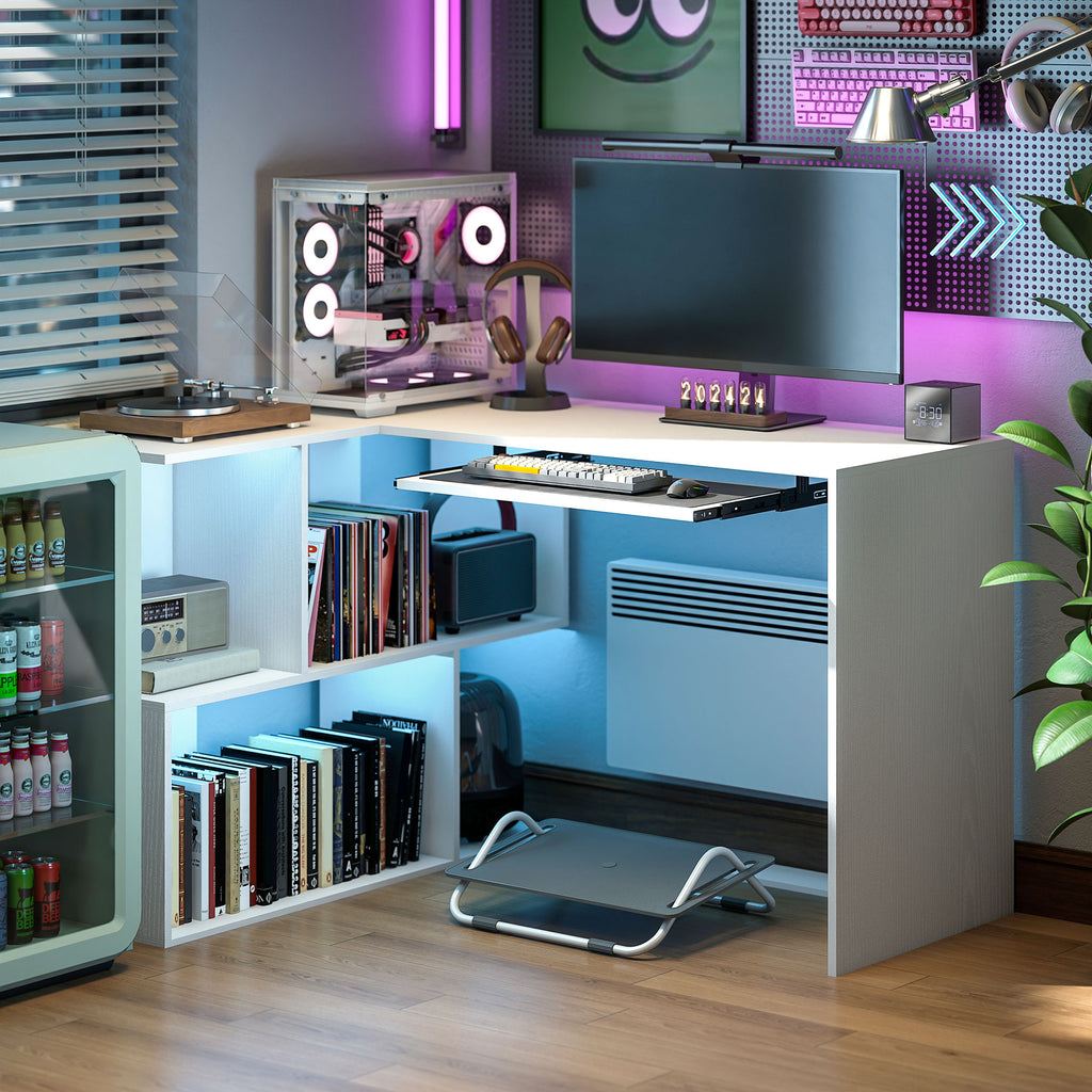 Scrivania Angolare Moderna 120x100x76 cm con Ripiano Scorrevole per Tastiera e Scaffale a 4 Ripiani Bianco
