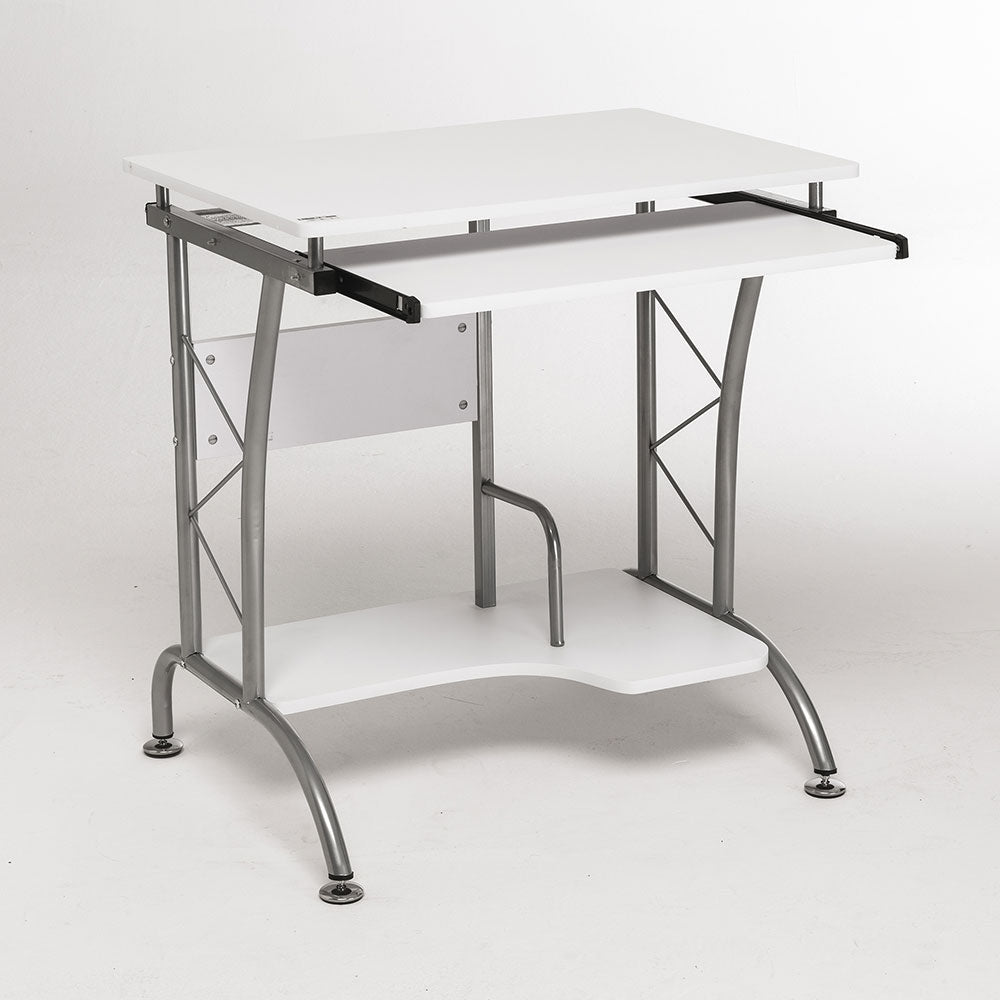 Scrivania portacomputer con piano estraibile in acciaio colore grigio, piani in mdf rivestito pvc bianco. Ideale per i piccoli spazi, ha tutto quello che serve per il vostro angolo computer, con il piano estraibile e mensola porta-case sagomata. La stuttura in acciaio garantisce solidità ma anche stile e personalità abbinata ai ripiani in MDF rivestiti colore bianco, si inserisce perfettamente anche in ambienti moderni e giovanili.