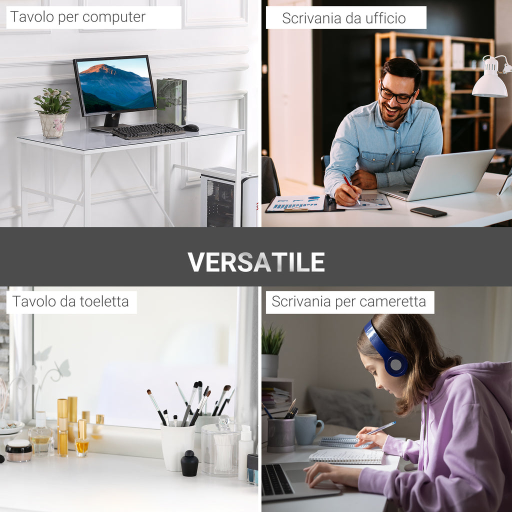 - IN METALLO E VETRO: Il telaio di questa scrivania moderna è costruito in metallo con finitura bianca. Ha quattro punti d'appoggio, un'ampia base e due supporti incrociati per garantirti la massima stabilità. Il piano d'appoggio è rivestito in vetro temperato: un materiale elegante, resistente e facile da pulire.