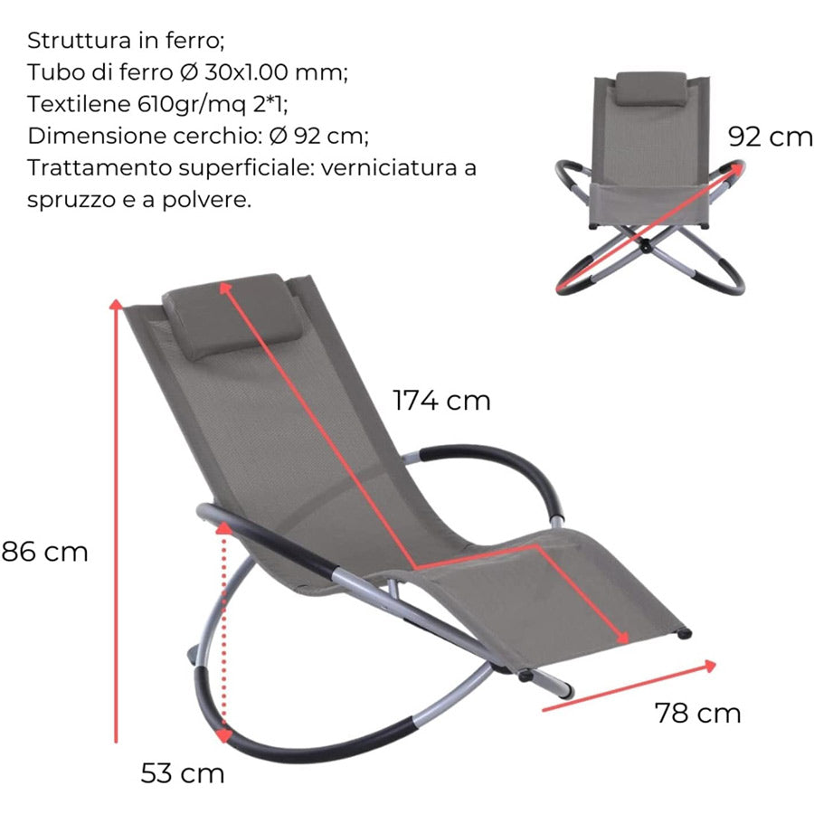 La sedia sdraio ellittica Grigio Profondo presenta una struttura in ferro robusto e un telo in textilene 2*1 da 610gr di colore Grigio Profondo.Il telo è idrorepellente e facilmente lavabile con acqua. è consigliato, dopo un utilizzo in zone marittime, ripulire la struttura con acqua dolce per evitare così che la salsedine possa eroderla.