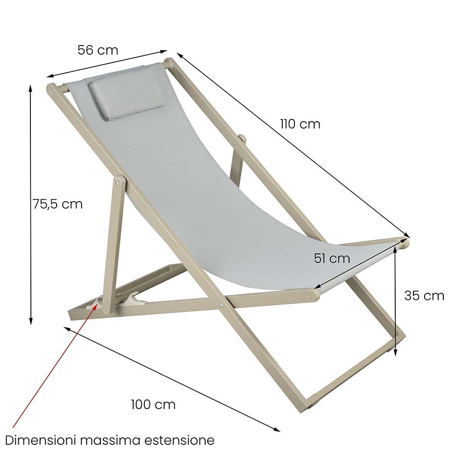 Con una dimensione, alla sua massima estensione, di 100 x 56 x H. 75,5 cm e una dimensione da chiusa di 60 x 8 x H. 132 cm la sedia a sdraio Gilda ti consente di gestire al meglio i tuoi spazi.