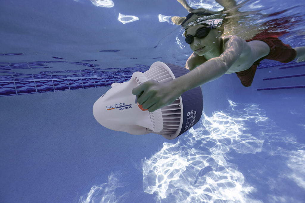 MARINE 300 della linea Recreational Dive Series di Nautica Seascooter è un Diver Propulsion Vehicle (DPV) elettrico che monta una Batteria Piombo-Acido ricaricabile da 12V/12AH con autonomia fino a 90 minuti. Con Nautica MARINE 300 è possibile cimentarsi con immersioni subacquee fino a 30mt di profondità o fare Snorkeling, divertendosi al mare o al lago. MARINE 300 può arrivare fino a 4,8kmh, è dotato di due differenti velocità di rotazione dell'elica e pesa solamente 8,2Kg.