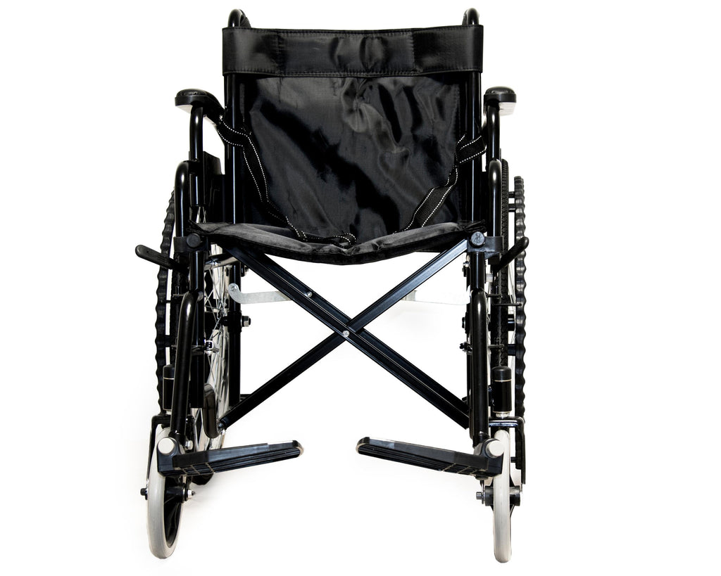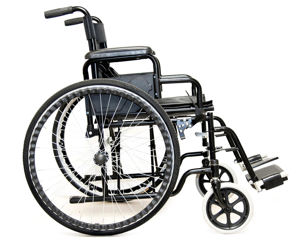 Questa carrozzina pieghevole ad auto spinta, adatta a persone con difficoltà motorie o di deambulazione, ha il telaio stabilizzante in acciaio al carbonio, ruote anteriori in PVC ad alta resistenza e posteriori a razze con pneumatici in gomma dotati di camera ad aria.