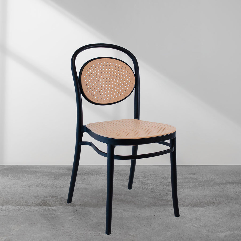 Il design della sedia Cosette ricorda quello delle eleganti e classiche sedie, ma reinventato con un materiale moderno e versatile, il polipropilene. Il contrasto di colori tra il beige dello schienale e della seduta, entrambi leggermente forellati, e il bianco della struttura dona alla sedia un carattere deciso e particolare. Ideale per uso sia all'interno che all'esterno, è perfetta per arredare una cucina o un living, oppure un patio o un locale.