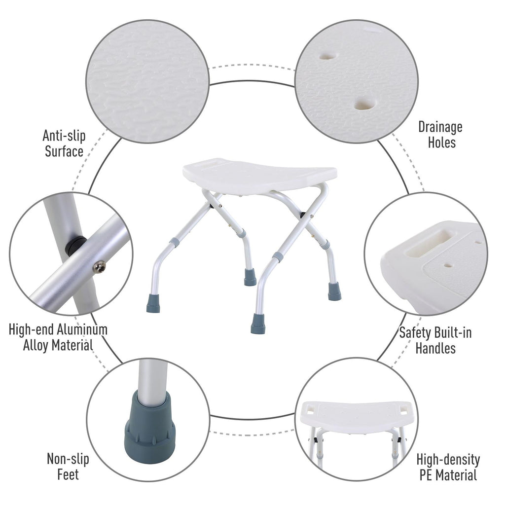 Nonostante le dimensioni compatte, questa sedia da doccia è perfetta per sostenere adulti fino a 136 kg di peso. In particolare, è progettata per aiutare anziani, gestanti o coloro che hanno subito un infortunio. È costruita con alluminio e PE, materiali impermeabili e facili da pulire, ideali per l'uso in ambienti interni o esterni. L'altezza della seduta è regolabile, in modo da venire incontro alle necessità di ognuno. Inoltre, grazi ai piedini antiscivolo, offre un supporto stabile e sicuro, ed è un dispositivo indispensabile per ritrovare la propria autonomia e privacy nell'utilizzo dei servizi igienici.