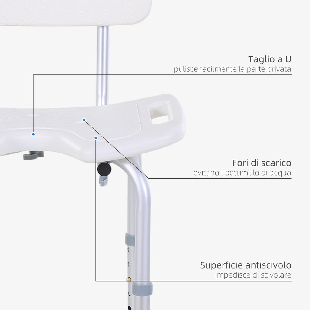 Sedia per doccia in plastica resistente con fori di drenaggio per impedire l'accumulo di acqua durante l'uso. Sedia doccia con gambe in alluminio resistenti all'acqua per dare la giusta stabilità e reggere fino a 136 kg di peso. L'altezza della sedia è regolabile su 8 livelli differenti. Dotato di piedini antiscivolo su ogni gamba. Anche gli angoli arrotondati della seduta garantiscono sicurezza. Sedia da doccia leggera con maniglie per consentire un trasporto facile. Montaggio necessario.