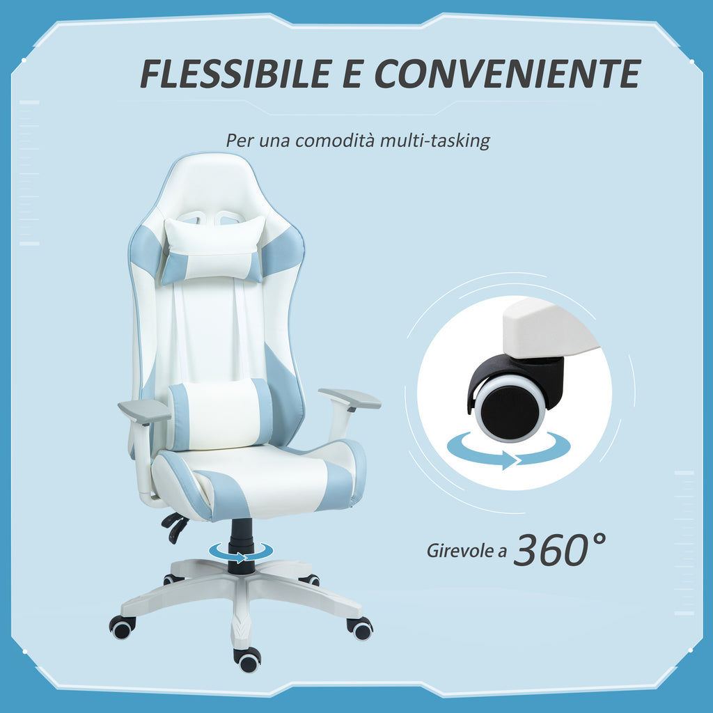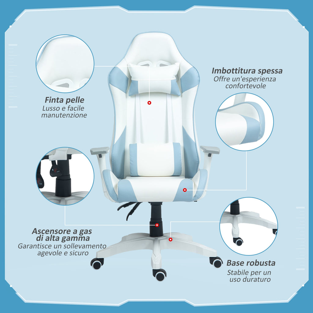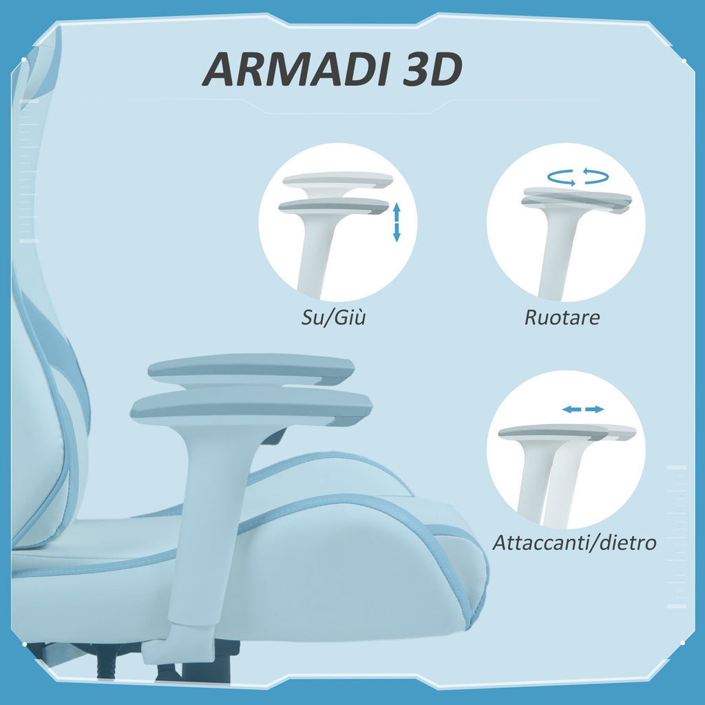 Sedia da Gaming Reclinabile 135° con Poggiatesta e Supporto Lombare 67x60x120-128 cm in Similpelle Azzurro