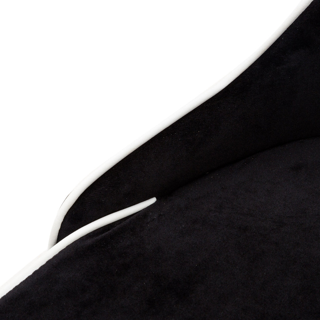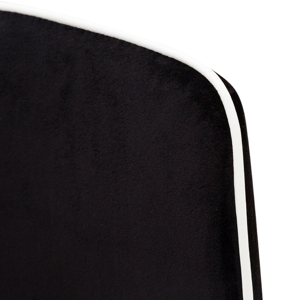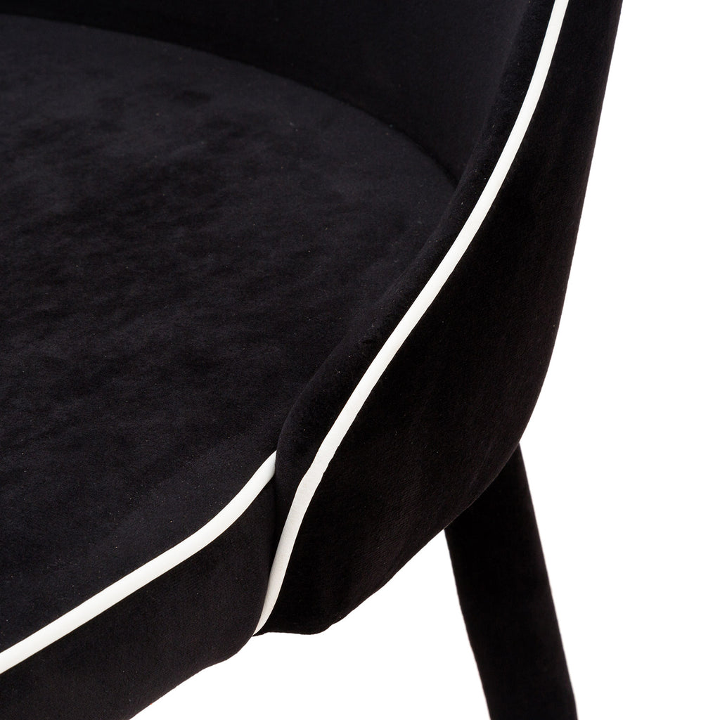 Sedia con struttura in metallo tubolare, Seduta e schienale con imbottitura in poliuretano e rivestimento in tessuto vellutato con cordino di profilatura in similpelle bianca.