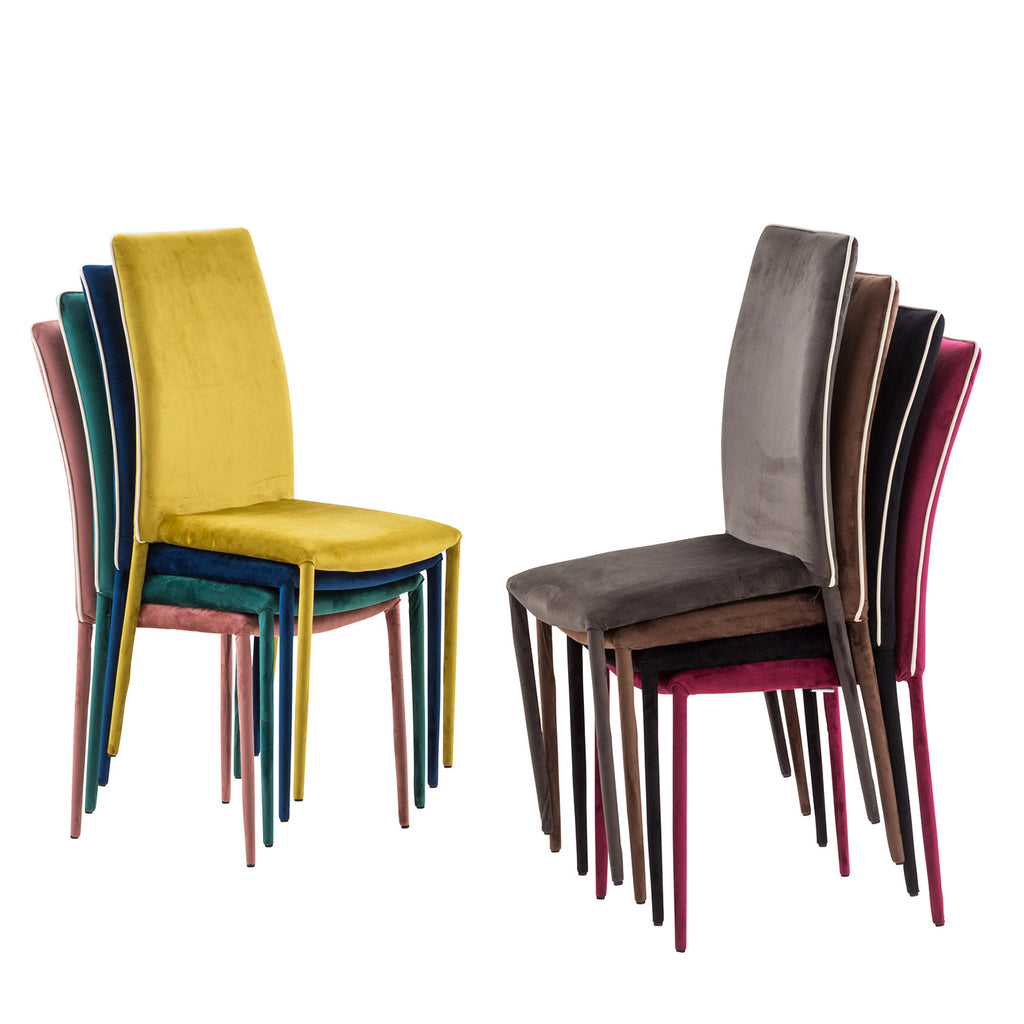 Sedia impilabile con struttura in metallo tubolare e imbottitura in poliuretano, interamente rivestita in velluto blue cobalto.