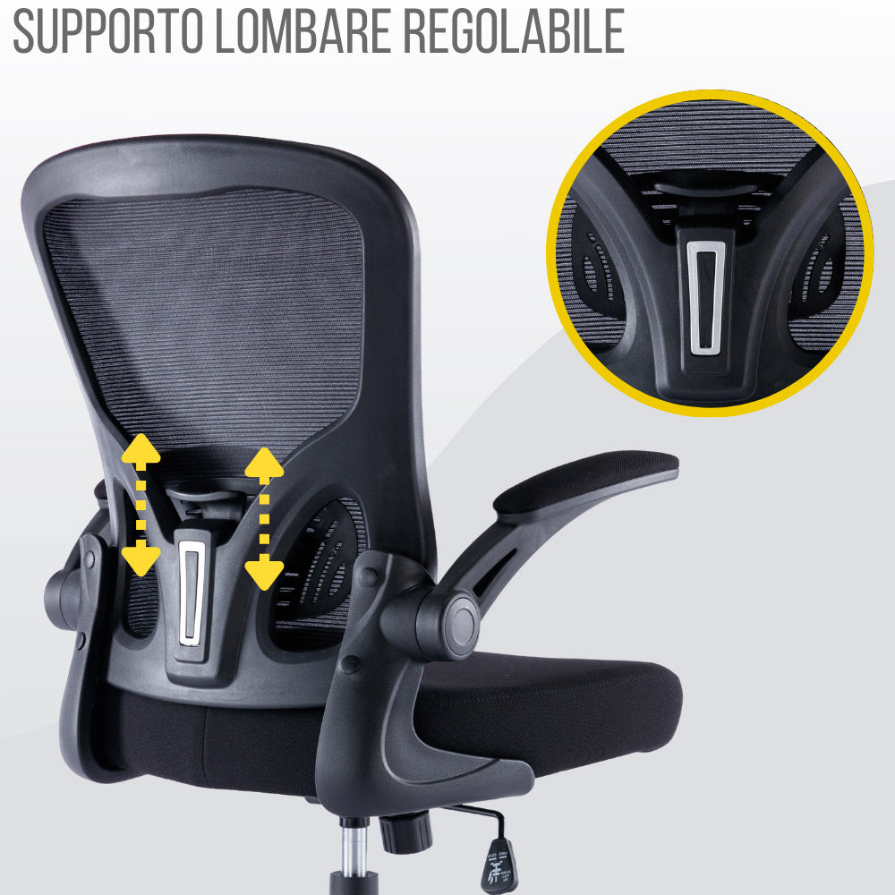 - Con braccioli pieghevoli 90° e supporto lombare regolabile: poltrona ergonomica dotata di braccioli reclinabili 90° e supporto lombare regolabile grazie a una semplice maniglia a scatto, elementi indispensabili per garantire comodità e piacere durante l'utilizzo anche protratto per ore