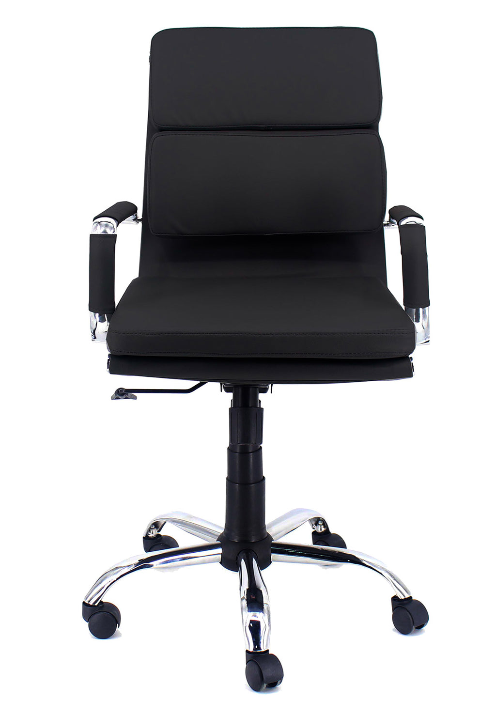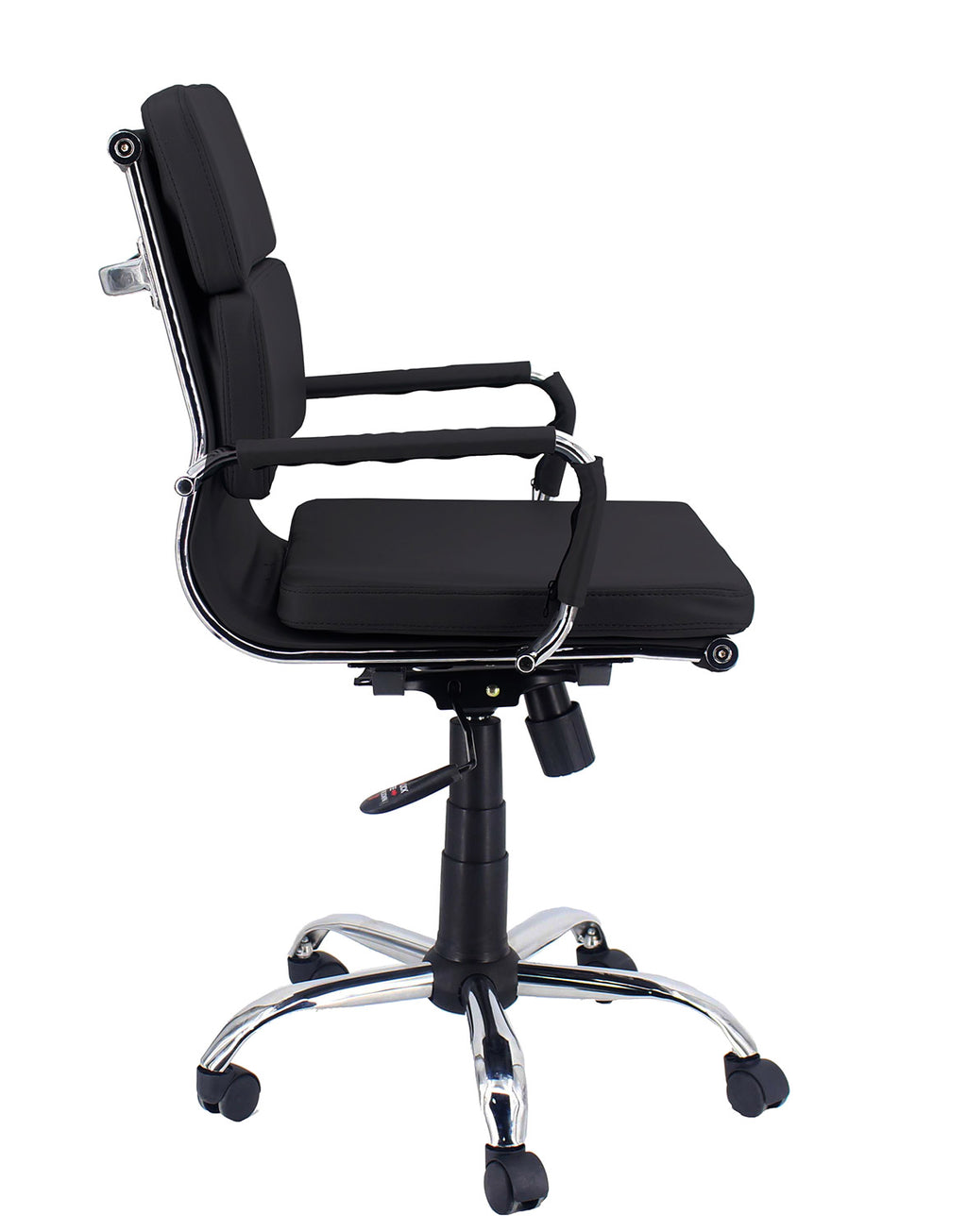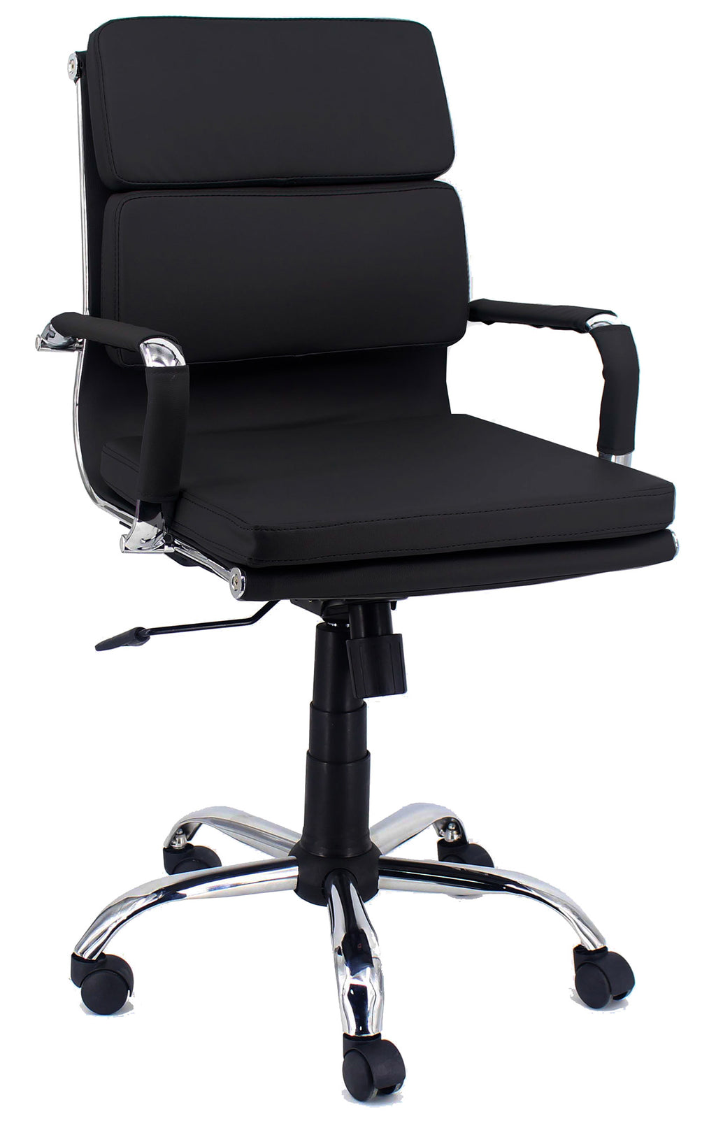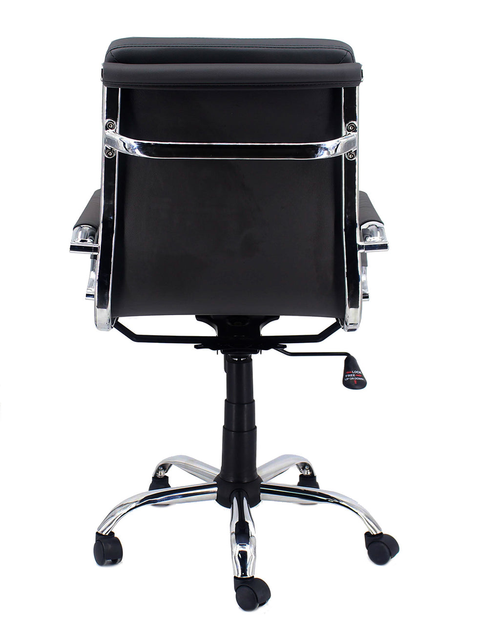 Poltrona da ufficio girevole, dotata di meccanismo di elevazione a gas e di meccanismo basculante. Muovendo la leva verso l'alto si agisce sull'altezza della seduta muovendo la leva verso l'esterno la seduta passa in modalità basculante e ritorna in posizione fissa riportando la leva verso l'interno in posizione di blocco. Struttura in metallo cromato con base a cinque razze, dotata di ruote in ABS. La seduta è con imbottitura in poliuretano rivestito con similpelle nera. Lo schienale è in tre moduli imbottiti in poliuretano e rivestiti in similpelle nera. Copribraccioli in similpelle bianca.