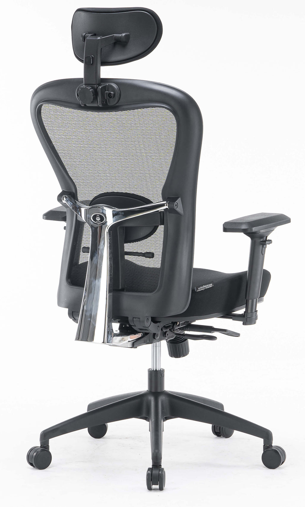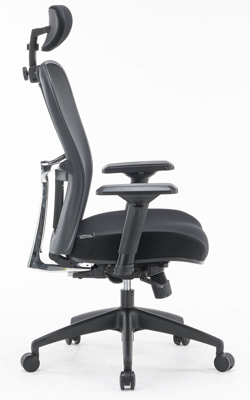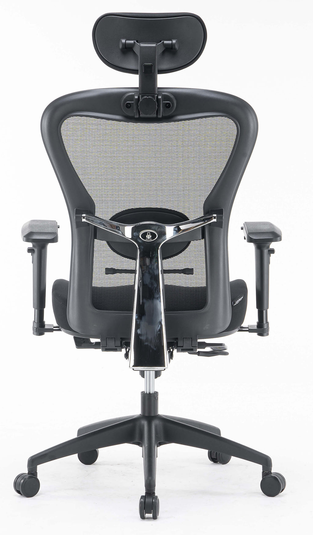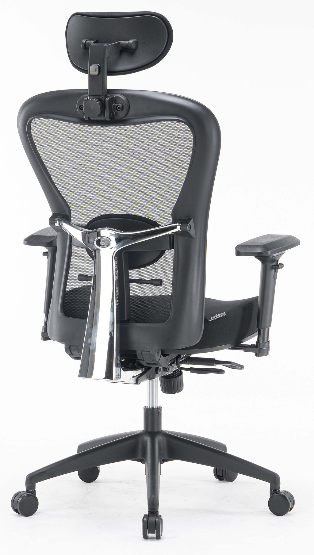 - Schienale regolabile in più posizioni, rivestito in rete tecnica traspirante nera con poggiatesta in tessuto imbottito e supporto lombare neri regolabili