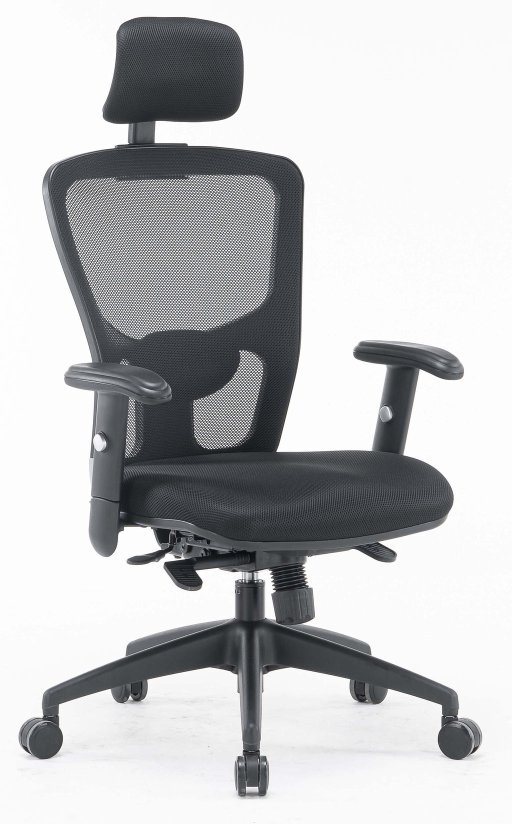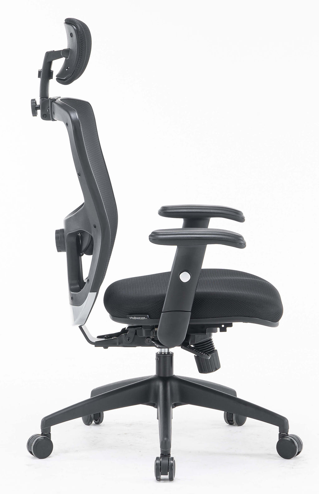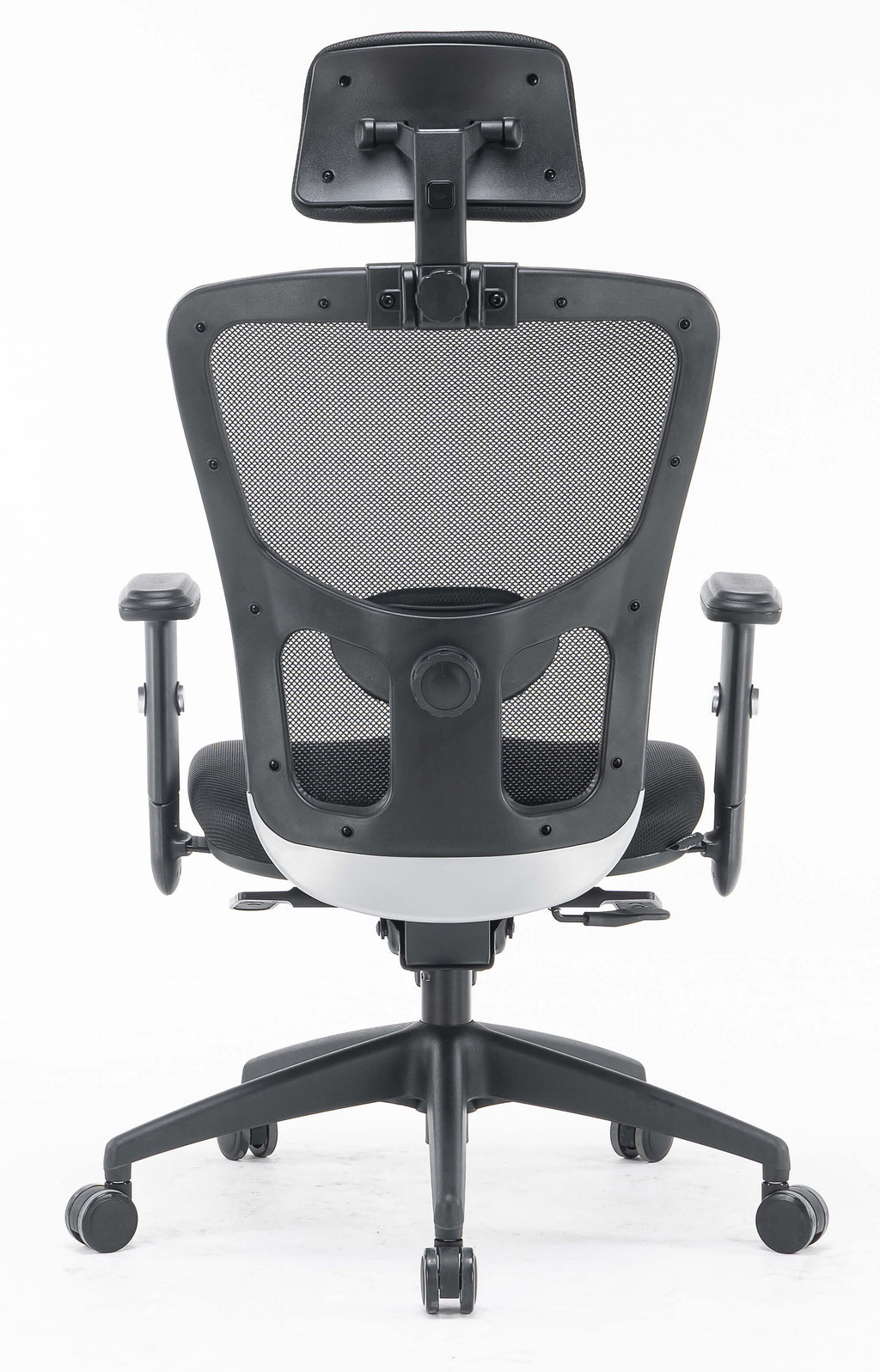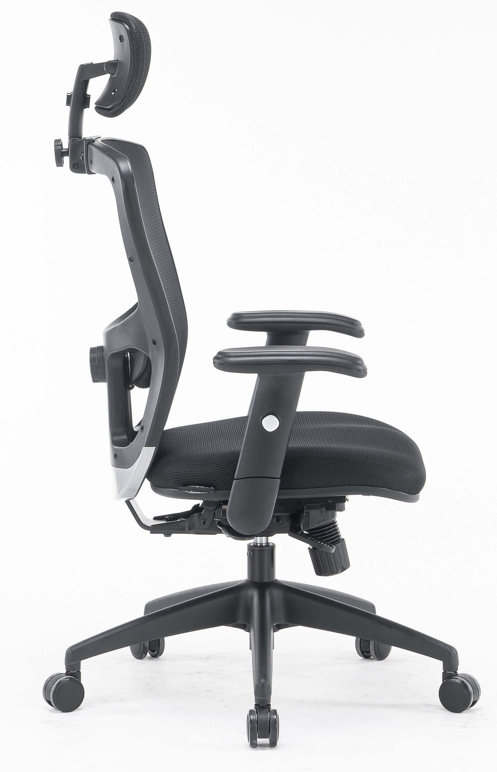 - Schienale regolabile in più posizioni, rivestito in rete tecnica traspirante nera con poggiatesta in tessuto imbottito e supporto lombare neri regolabili
