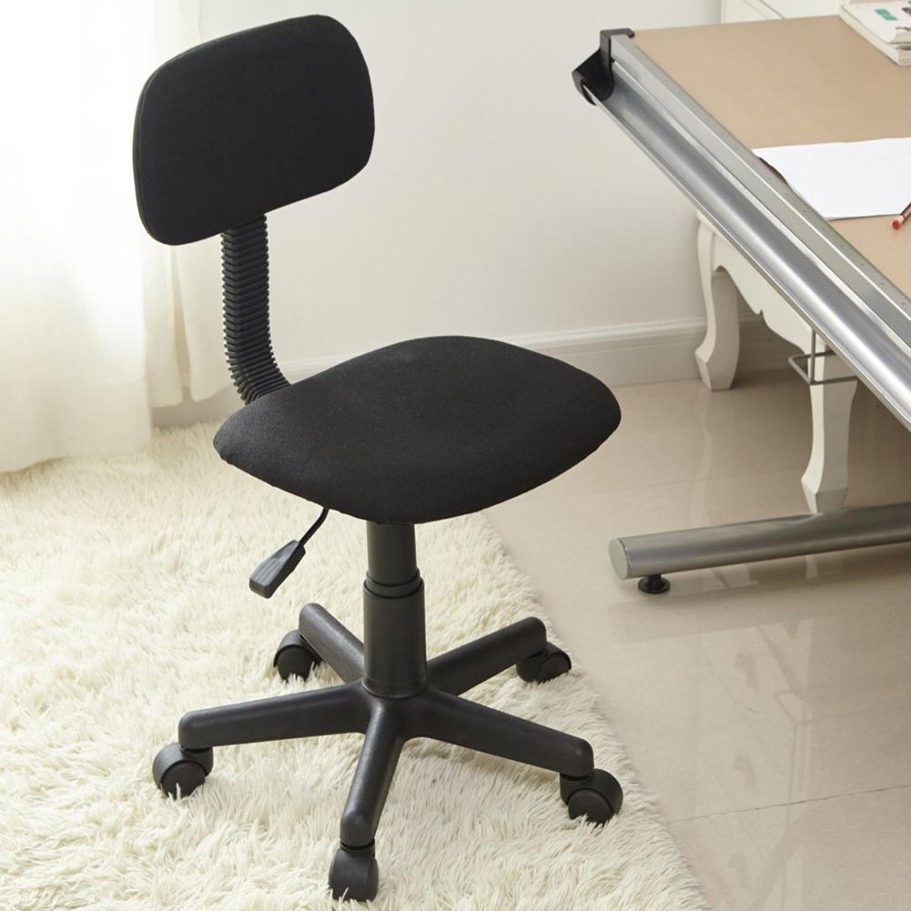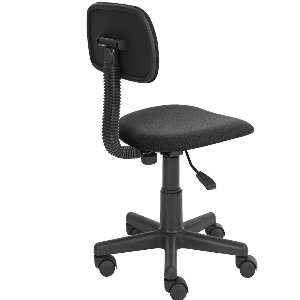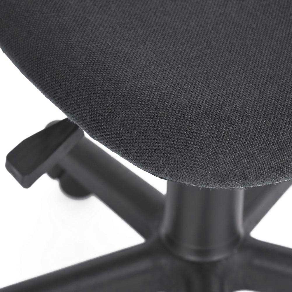 Poltroncina dattilo senza braccioli, con struttura e razza in nylon nero. Seduta e schienale imbottiti e rivestiti in tessuto.