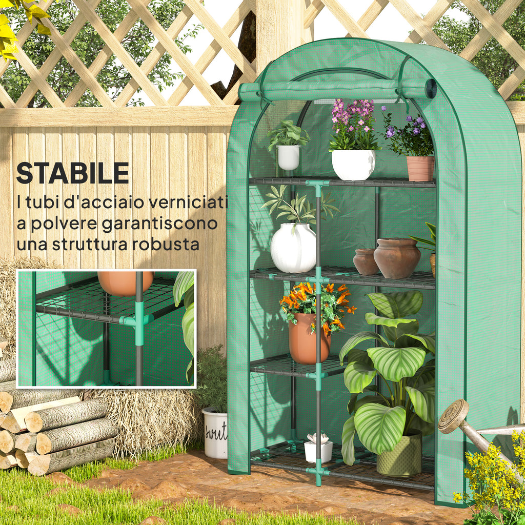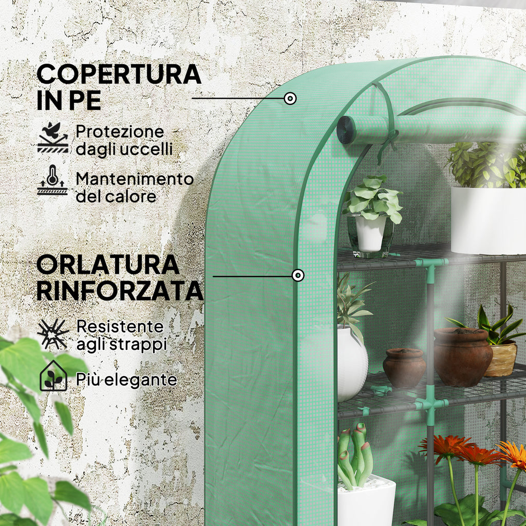 Rivoluziona il tuo giardino con la serra per piante! Il suo design a 4 livelli offre ampio spazio per inserire vasi di diversa misura, protetti da una copertura in PE da 140g/m² che scherma le piante dai raggi UV e lascia passare la giusta quantità di luce solare, mentre la porta avvolgibile facilita l'accesso e massimizza la ventilazione. Questa serra rappresenta il supporto ideale per chi creare un rigoglioso angolo verde portatile in qualsiasi spazio esterno! I ripiani a 4 livelli della serra a parete massimizza lo spazio a disposizione per tutte le piante. La copertura in PE da 140g/mq della serra per orto protegge le piante dai raggi UV e ne aumenta la longevità. La porta con chiusura a zip della serra per piante garantisce un facile accesso all'interno e una ventilazione ottimale. La struttura in acciaio verniciato a polvere offre un supporto robusto e stabile. Il bordo orlato rinforza la copertura ed evita gli strappi. Facile da montare.