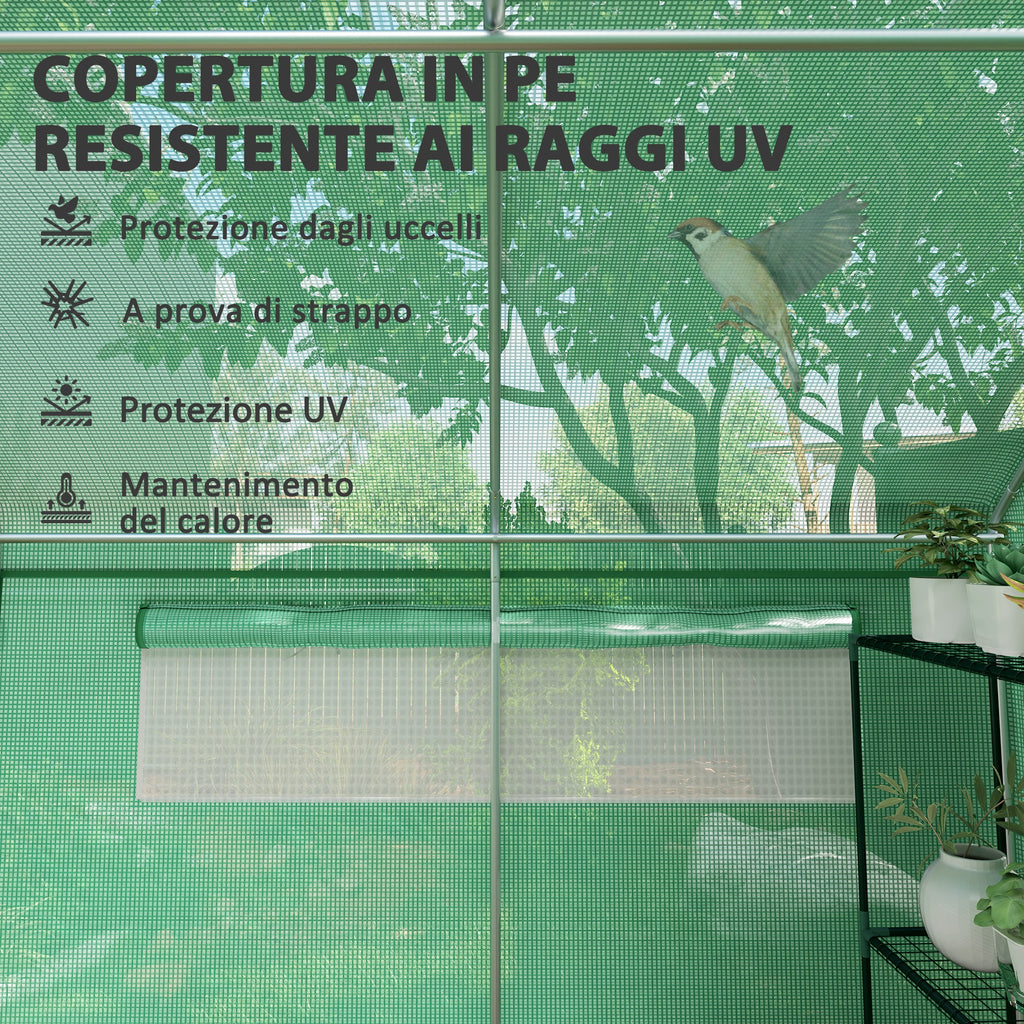 - COPERTURA IN PLASTICA La copertura in PE della serra per orto è resistente ai raggi UV, protegge dalle alte temperature e rallenta l'invecchiamento, filtrando la luce solare dell'85%. La struttura presenta una griglia di rinforzo centrale antistrappo
