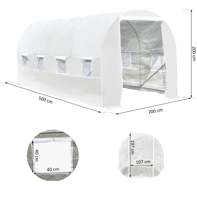 Se vuoi dedicarti al giardinaggio durante tutto l'anno, questa serra a tunnel è perfetta per te! Costruita con una resistente struttura in acciaio zincato, e ricoperta con un telo in polietilene, è perfetta per proteggere le tue piante dalle intemperie e durare nel tempo.