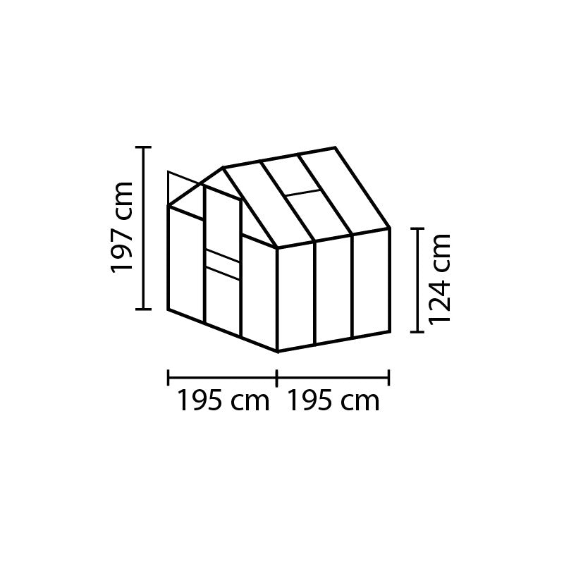 Dimensioni della base (larghezza x profondità): 192 x 192 cm - Altezza minima/massima: 124/197 cm - Superficie: 3.8 m² - Pareti in lastre di policarbonato alveolare doppia parete da 4 mm anti-UV - kit di fondamenta disponibile come optional