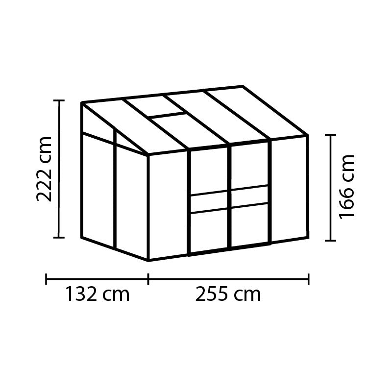 Dimensioni della base (larghezza x profondità): 128 x 254 cm - Altezza minima/massima: 166/222 cm - Superficie: 3,3 m² - Pareti in lastre di policarbonato alveolare doppia parete da 4 mm anti-UV - kit di fondamenta disponibile come optional