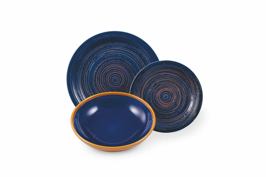 Terra e mare si mescolano l'uno con l'altro, fondendosi fino a diventare un unico elemento naturale: la fluidità dell'acqua e la resistenza della terra, creano un incredibile e potente gioco di colori che si sposa perfettamente con la superficie lucida del gres. I magici intrecci di colore e la compattezza e robustezza del gres regalano un servizio da tavola con cui giocare sulla mise en place.