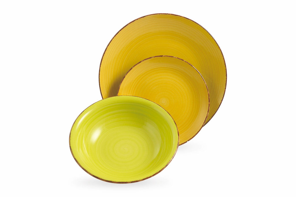 Gres dipinto a mano: forza e unicità I piatti realizzati in gres si fanno notare subito per la forte personalità svelata dalla robustezza del materiale. Spessi e resistenti, mantengono il calore delle pietanze calde e ne agevolano il servizio. Ogni piatto è un pezzo unico: dipinti a mano conservano dettagli originali e inimitabili, immediatamente visibili nelle pennellate, nei decori, nelle finiture e nell'effetto finale restituito con l'apparecchiata. Aggiungiamo colore alla tavola. Il piatto fondo, del servizio Baita, tinge la sua superficie inferiore negli stessi colori del piatto piano e del piatto frutta. Il risultato? Una tavola più ricca, più intensa, con una doppia anima da scoprire.