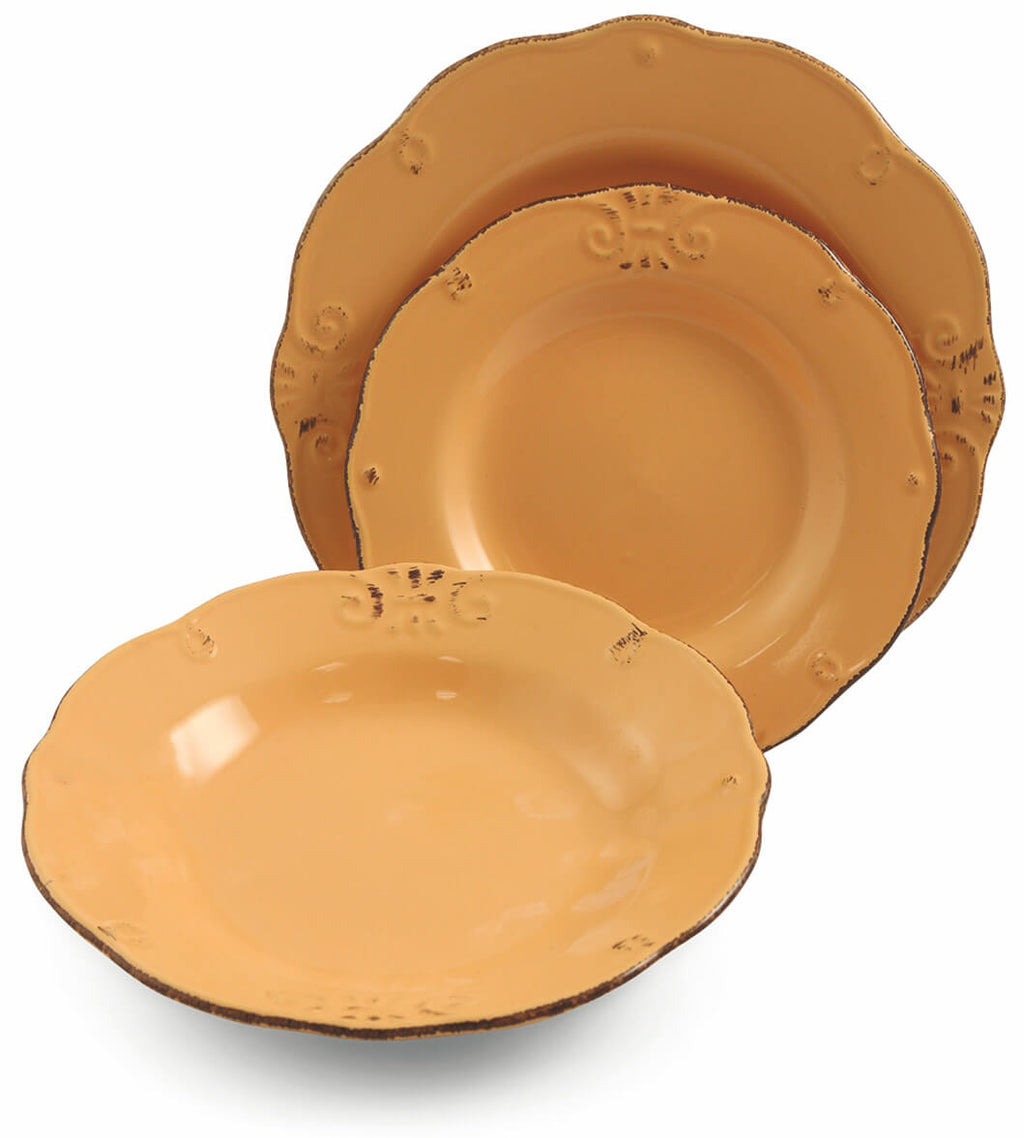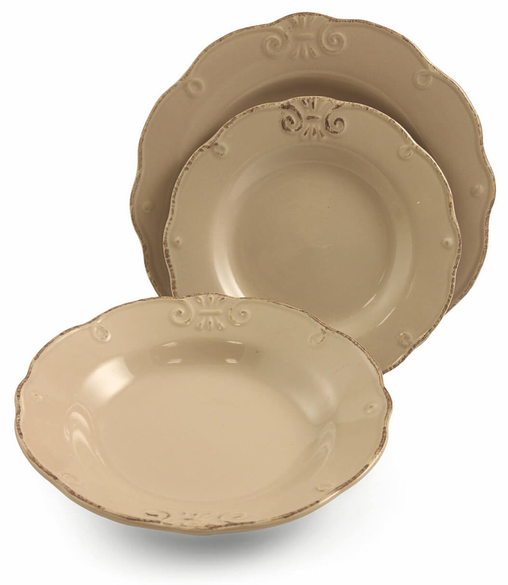 Il servizio Duchessa incanta per il bordo ondeggiante, i ghirigori a rilievo e la finitura anticata che ci catapultano improvvisamente in un'atmosfera d'altri tempi.