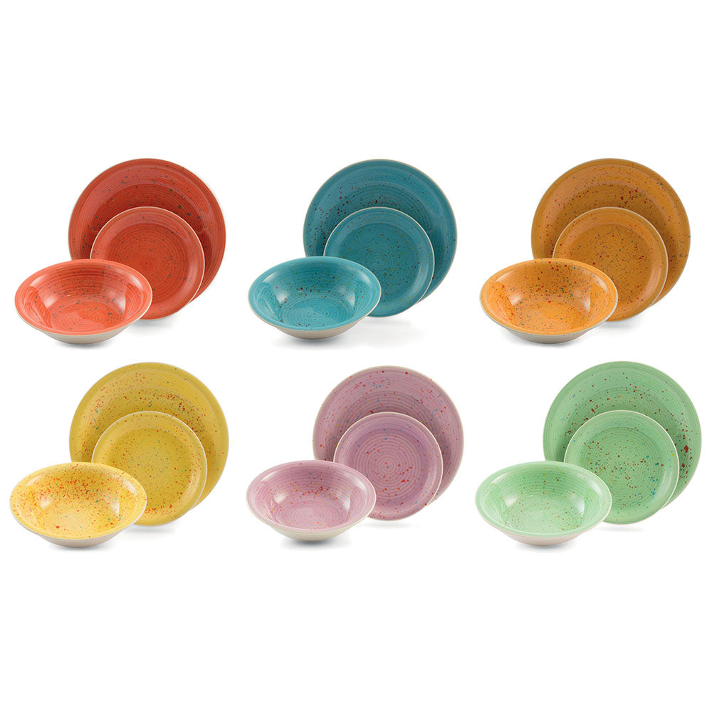 - Ogni servizio è formato da 6 posti tavola, ognuno con un decoro o un colore diverso dagli altri piatti della stessa apparecchiata.
