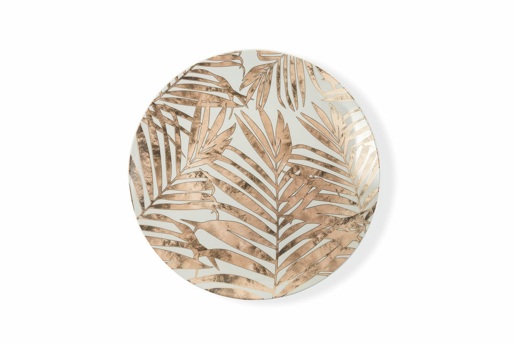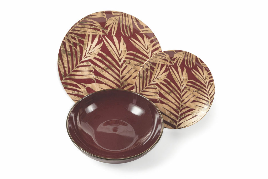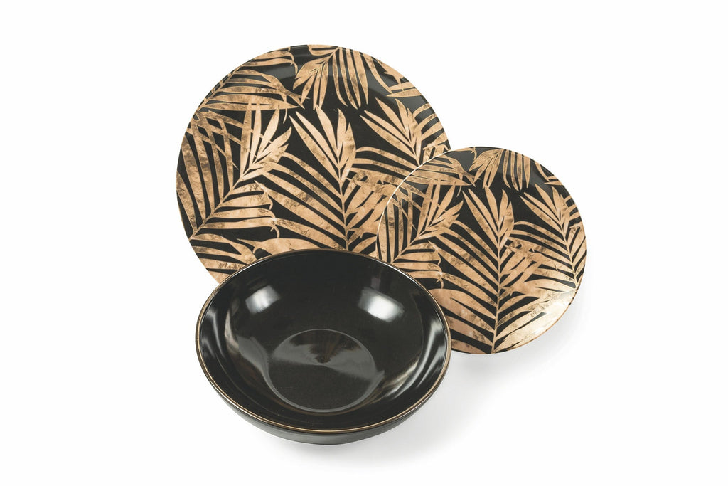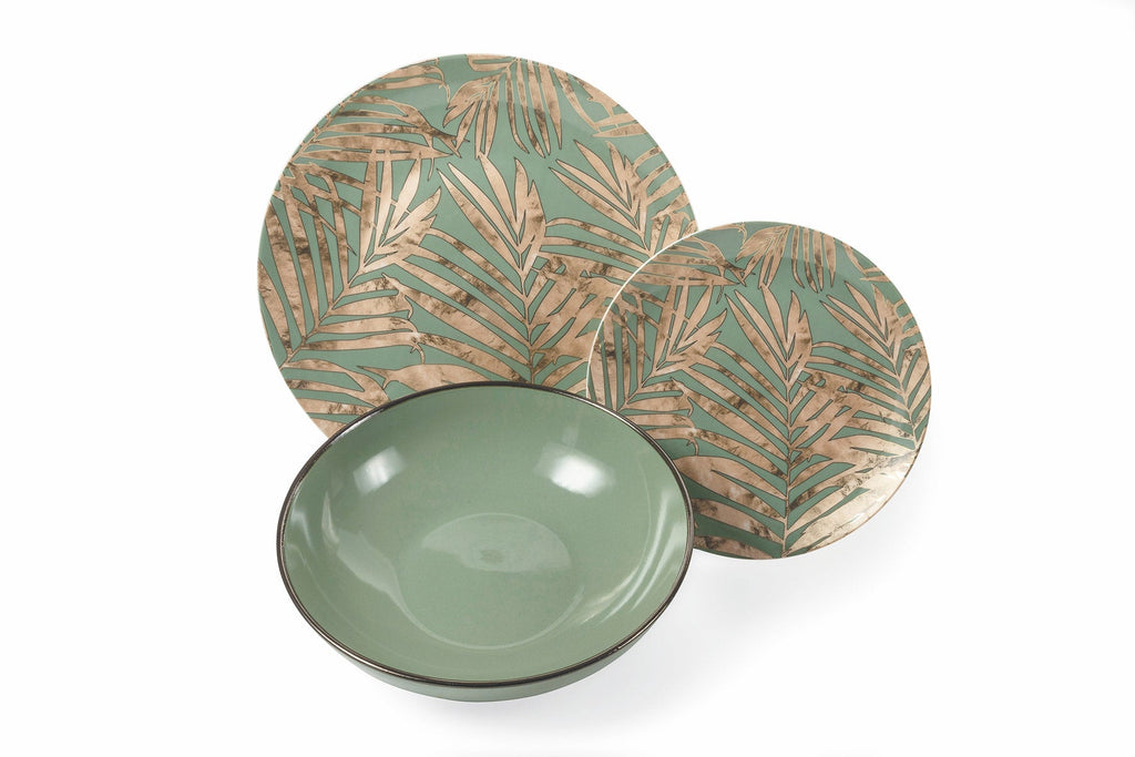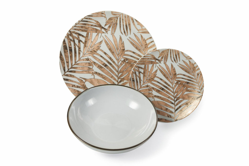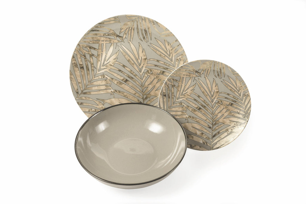 Porcellana e gres: il mix perfetto tra funzionalità e raffinatezza. Eleganza e leggerezza contraddistinguono i piatti piani e i piatti frutta, realizzati in finissima porcellana bianca sulla quale è applicata la decalcomania. Il gres smaltato dei sei piatti fondi, invece, porta in tavola la funzionalità: spesso e resistente, infatti, mantiene il calore di primi piatti caldi come zuppe e minestre e ne agevola il servizio. La superficie smaltata esalta le cromie della tavola. L?apparecchiata Forest Chic, punta al luxury con folte decorazioni gold e colori alla moda. Chi ama osare nell?abbigliamento, ama osare anche in tavola e questo servizio è il modo migliore per farlo.