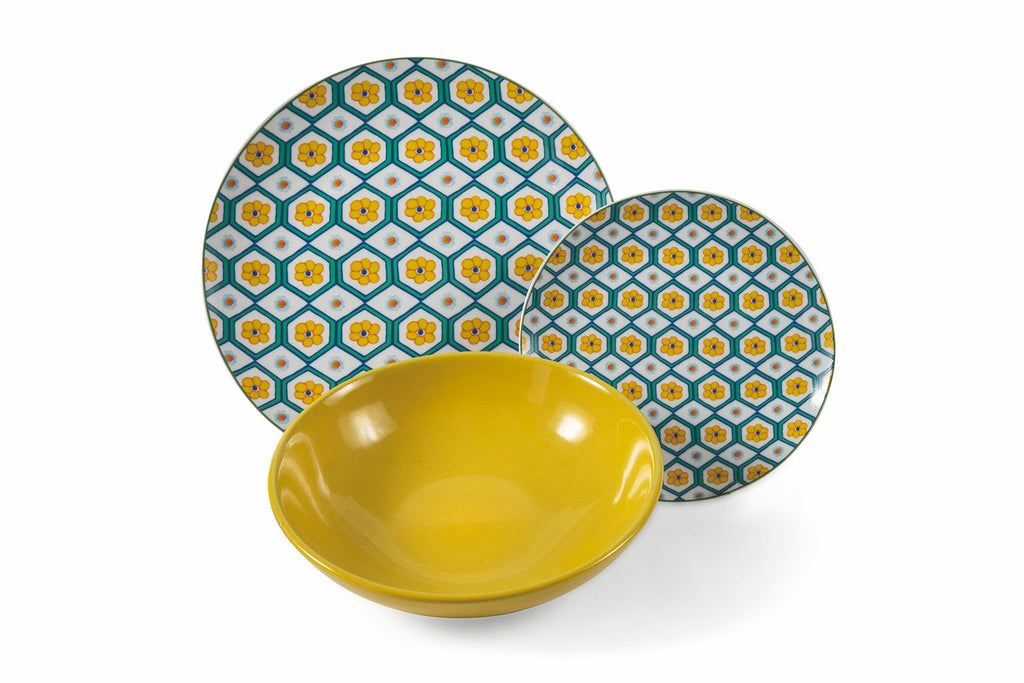 Porcellana e gres: il mix perfetto tra funzionalità e raffinatezza. Eleganza e leggerezza contraddistinguono i piatti piani ed i piatti frutta,realizzati in finissima porcellana bianca sulla quale è applicata la decalcomania. Il gres smaltato dei sei piatti fondi, invece, porta in tavola la funzionalità: spesso e resistente mantiene il calore di primi piatti caldi come zuppe e minestre e ne agevola il servizio. La superficie smaltata esalta le cromie della tavola. Scomposti a tavola Ogni servizio è formato da 6 posti tavola, ognuno con un decoro o un colore diverso dagli altri piatti della stessa apparecchiata. Chi sceglie gli Scomposti avrà una tavola non convenzionale e diversa, multicolore, con fantasie e colori alternati. Attribuiamo ad ogni ospite seduto attorno ad una tavola un colore diverso, perché ognuno contribuisce in modo differente alla convivialità.