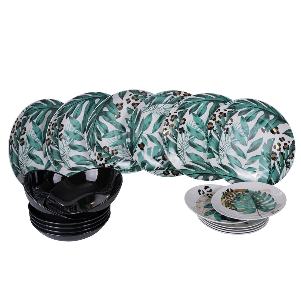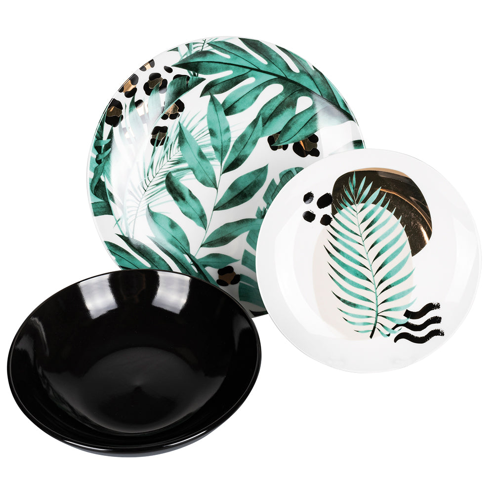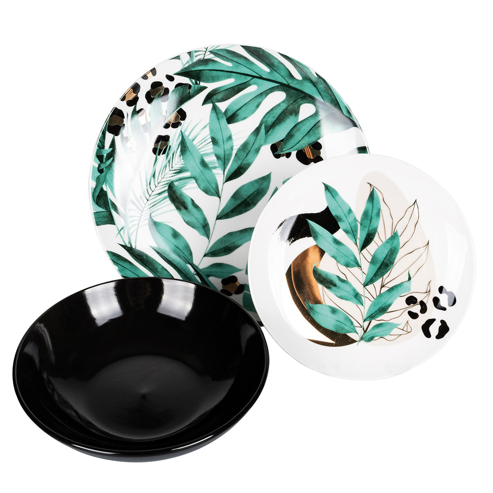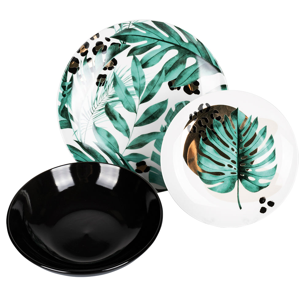 Lo stile jungle è l'lternativa perfetta per creare un piccolo spazio verde sulla tua mise en place, un oasi incantevole arricchita da un tocco di selvaggio animalier. La linea Samana si ispira proprio a questo: un esplosione di eleganti foglie verdi esotiche che si intersecano fra loro su sfondi uniformi ma arricchiti da dettagli che, nella loro semplicità, danno un tocco di colore e ricercatezza.