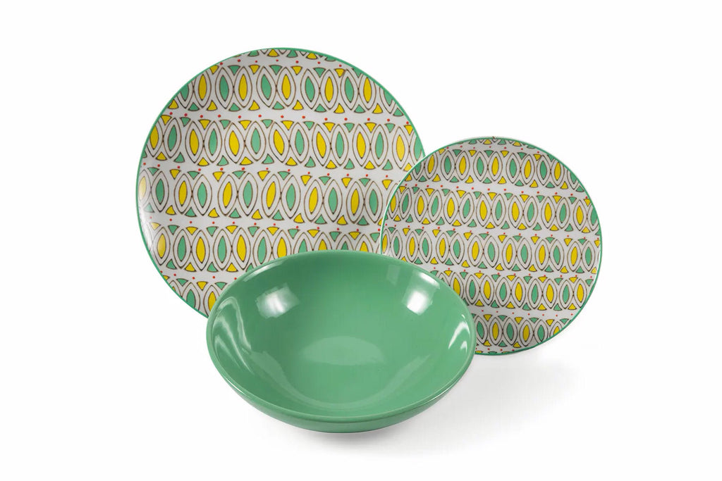Eleganza e leggerezza contraddistinguono i piatti piani ed i piatti frutta,realizzati in finissima porcellana bianca sulla quale è applicata la decalcomania. Il gres smaltato dei sei piatti fondi, invece, porta in tavola la funzionalità: spesso e resistente mantiene il calore di primi piatti caldi come zuppe e minestre e ne agevola il servizio. La superficie smaltata esalta le cromie della tavola. Scomposti a tavola Ogni servizio è formato da 6 posti tavola, ognuno con un decoro o un colore diverso dagli altri piatti della stessa apparecchiata. Chi sceglie gli Scomposti avrà una tavola non convenzionale e diversa, multicolore, con fantasie e colori alternati. Attribuiamo ad ogni ospite seduto attorno ad una tavola un colore diverso, perché ognuno contribuisce in modo differente alla convivialità.