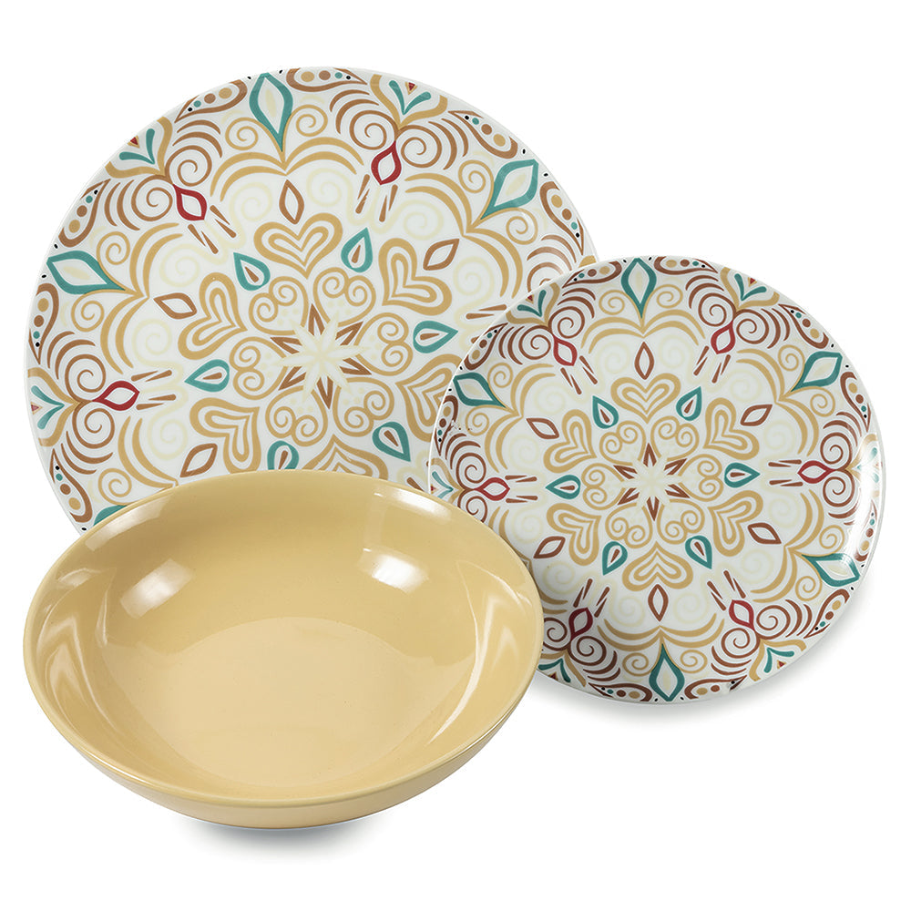 Porcellana e gres: il mix perfetto tra funzionalità e raffinatezza. Eleganza e leggerezza contraddistinguono i piatti piani ed i piatti frutta, realizzati in finissima porcellana bianca sulla quale è applicata la decalcomania. Il gres smaltato dei sei piatti fondi, invece, porta in tavola la la funzionalità: spesso e resistente mantiene il calore di primi piatti caldi come zuppe e minestre e ne agevola il servizio. La superficie smaltata esalta le cromie della tavola.