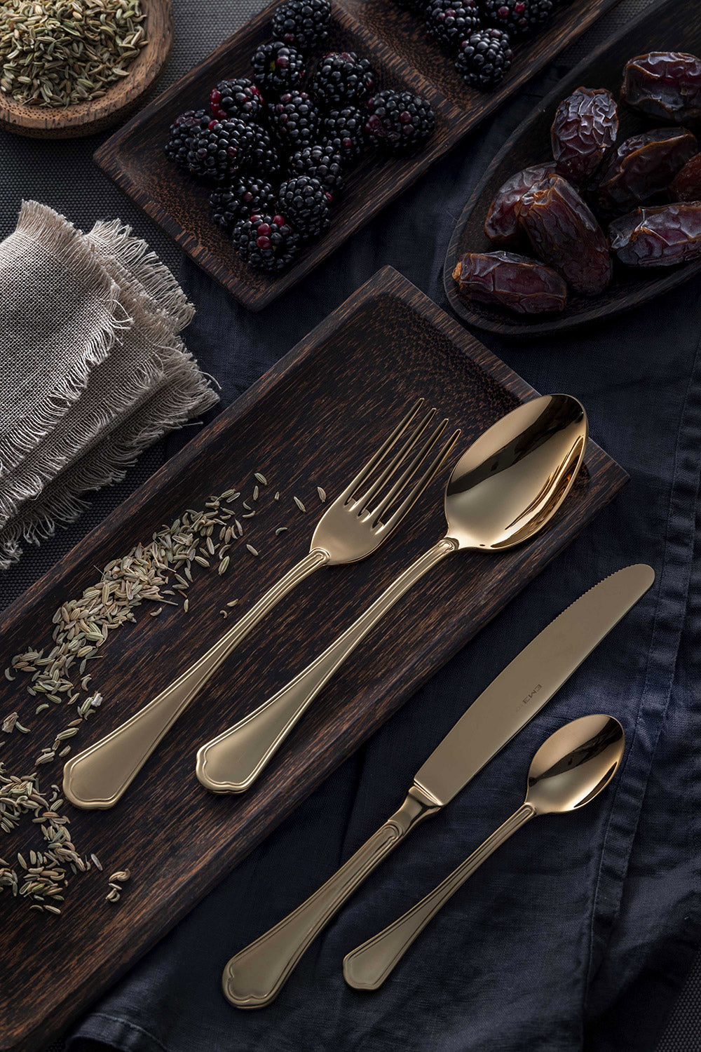 Domus Gold è una collezione di posate in acciaio inossidabile 18/10 lucidato a specchio con finitura PVD dorata.