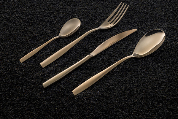 Eleven Rosé è una collezione di posate in acciaio inossidabile 18/10 lucidato a specchio dalla ricercata e raffinata finitura PVD brunita.