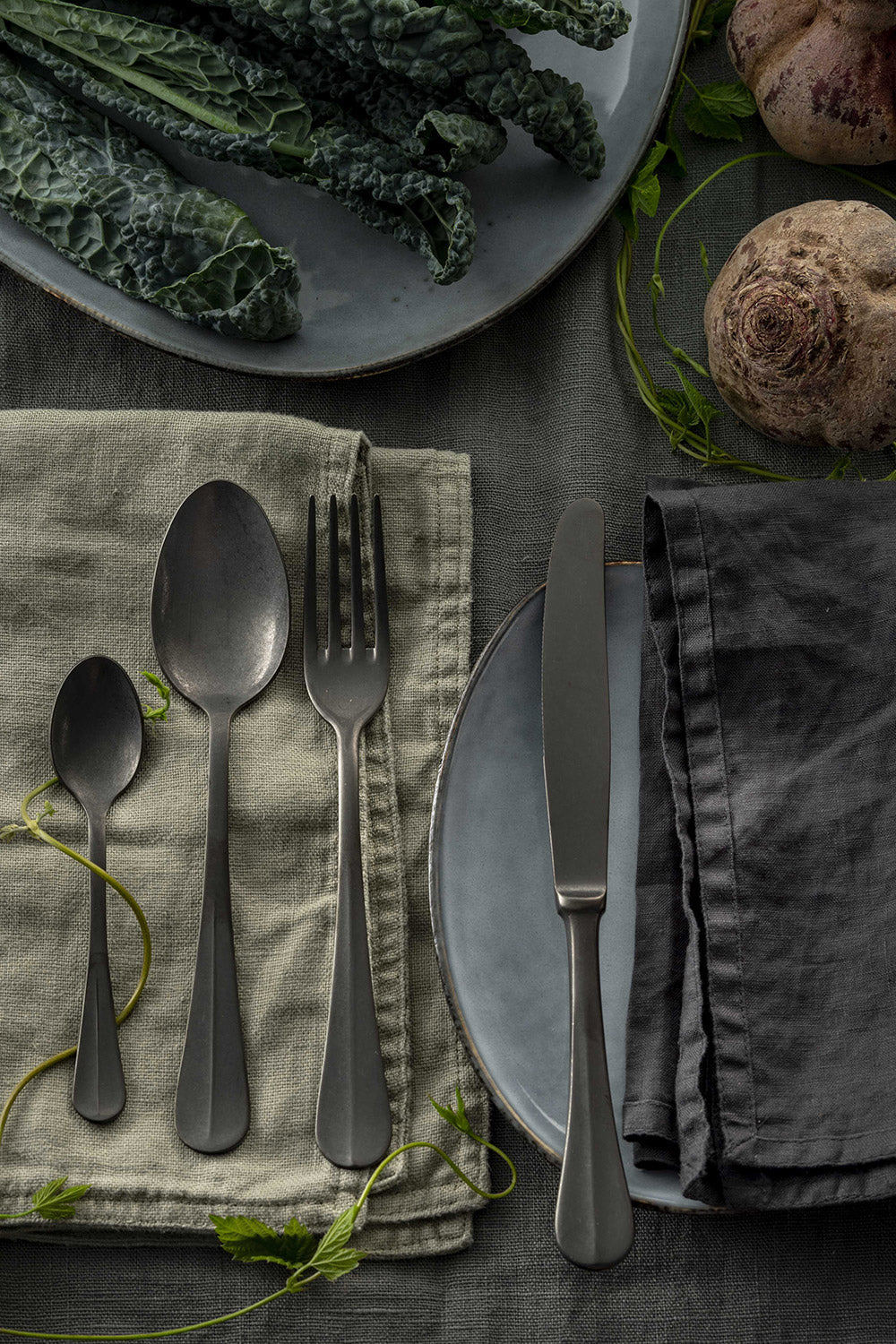 Royal Retrò Black è una collezione di posate in acciaio inossidabile 18/10 con una combinazione ricercata di finitura retrò e PVD nero.