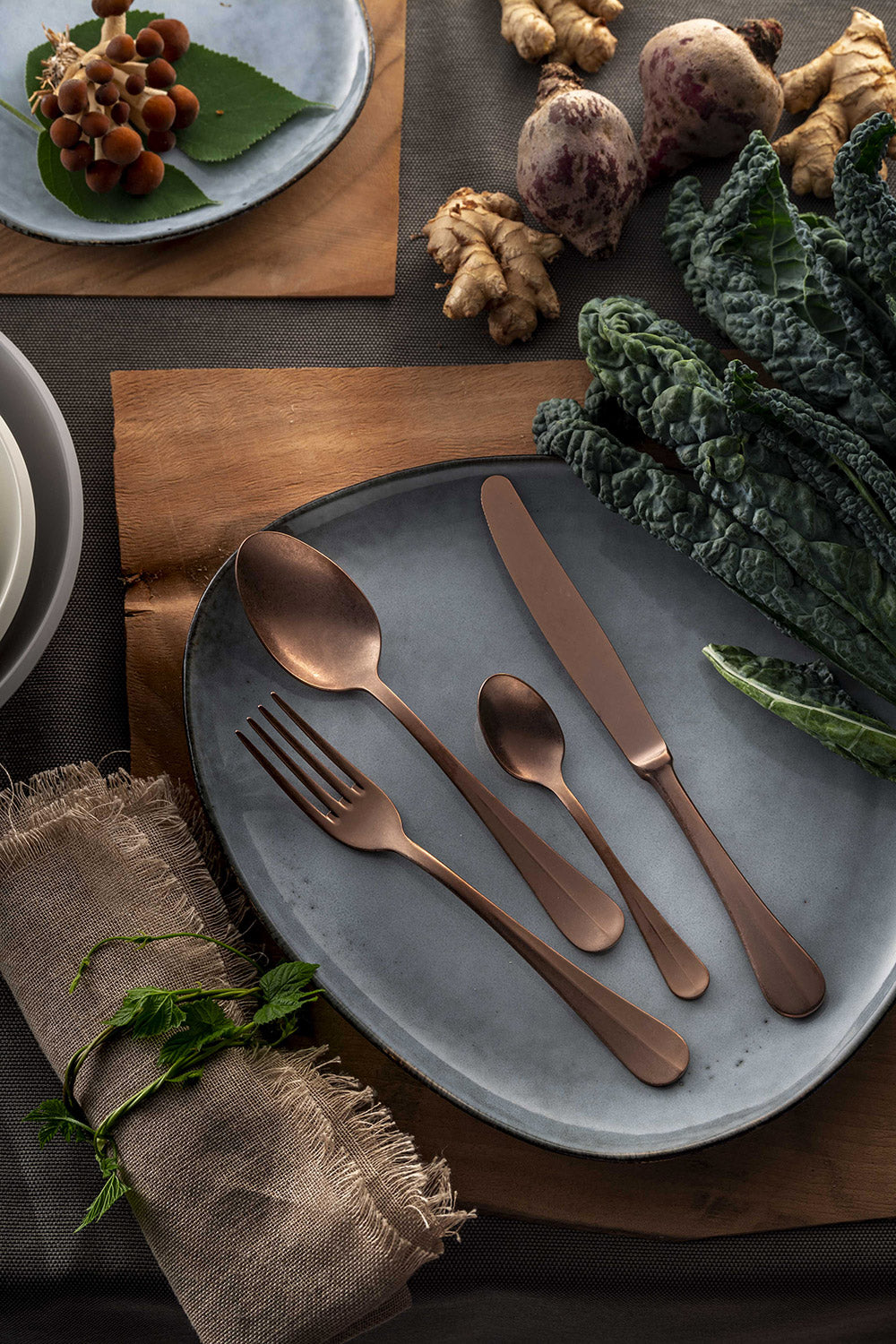 Royal Retrò Chocolate è una collezione di posate in acciaio inossidabile 18/10 con una combinazione ricercata di finitura retrò e PVD cioccolato.