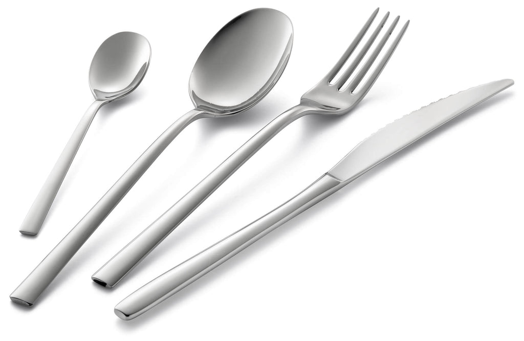 Set 24 pezzi per 6 persone Fashion con linee dal design contemporaneo e di tendenza in particolar modo riconoscibili sulle morbide rotondità. Realizzati in acciaio lucido 18/10.