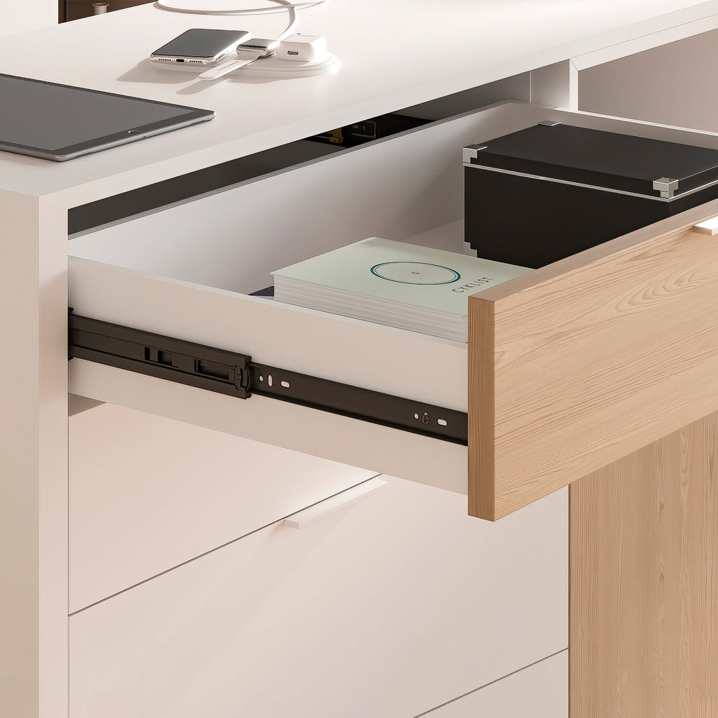 Guide con estrazione totale per cassetti con chiusura soft che fornisce una chiusura ammortizzata del cassetto, e uno scivolamento morbido e silenzioso grazie ai suoi cuscinetti a sfera di alta qualità. Sono noti, inoltre, per la grande capacità di carico che può arrivare a sopportare fino a 35 kg per cassetto. Il montaggio al cassetto si realizza mediante viti e lo smontaggio con grilletto.