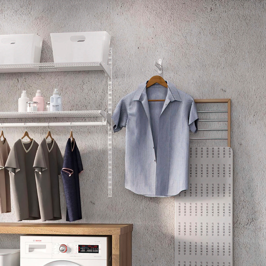 I ganci appendiabiti Jagmet si ripiegano per risparmiare spazio negli armadi, negli spogliatoi o nelle lavanderie. I ganci sono posizionati sopra i fori, consentendo di abbassare il gancio senza cadere.Sono pensate per essere fissate a parete e realizzate in acciaio laccato bianco e in plastica. Questo set è composto da due ganci insieme alle viti e ai tasselli necessari per il loro montaggio.