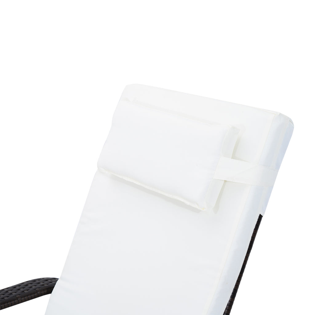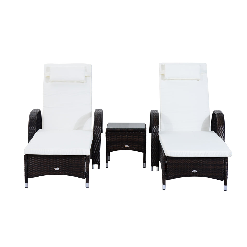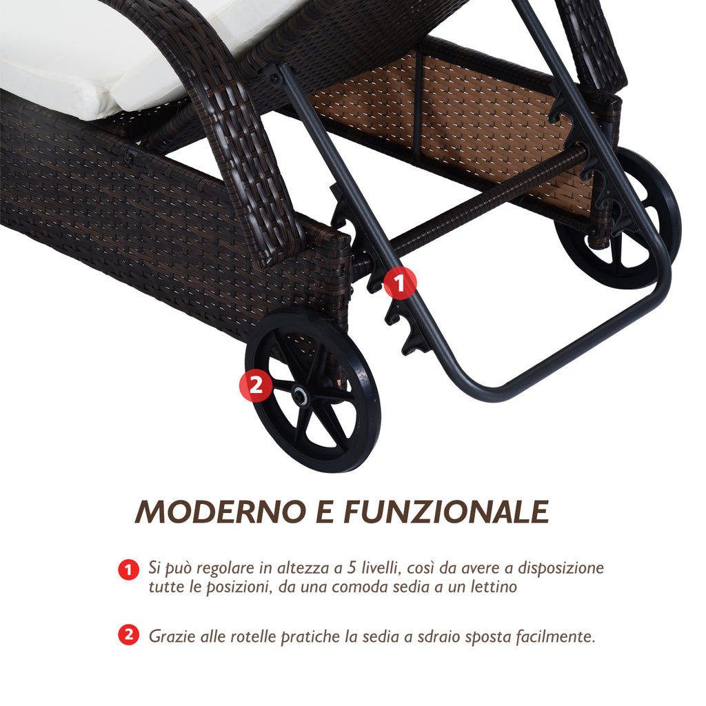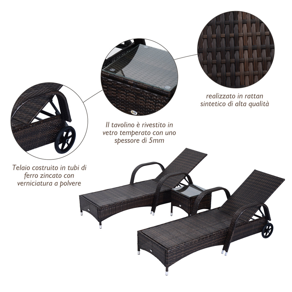 Set 2 Lettini Prendisole da Giardino in Rattan Reclinabili Imbottiti con Rotelle e Tavolino Marrone