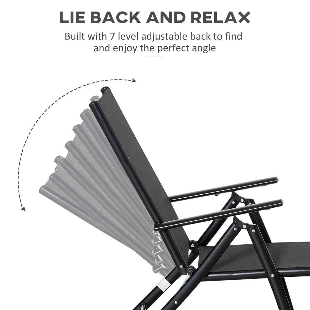 Goditi il relax all'aperto con questo set di due sedie da giardino . L'angolo posteriore può essere regolato su 7 diverse posizioni, impostando il livello più adatto alle tue esigenze. Grazie al tessuto a rete per la seduta, puoi rilassarti comodamente mentre la tua pelle respira senza problemi. Realizzato in alluminio verniciato a polvere, ogni lettino prendisole è rifinito con braccioli per un maggiore comfort. Inoltre, il design pieghevole garantisce un facile trasporto!