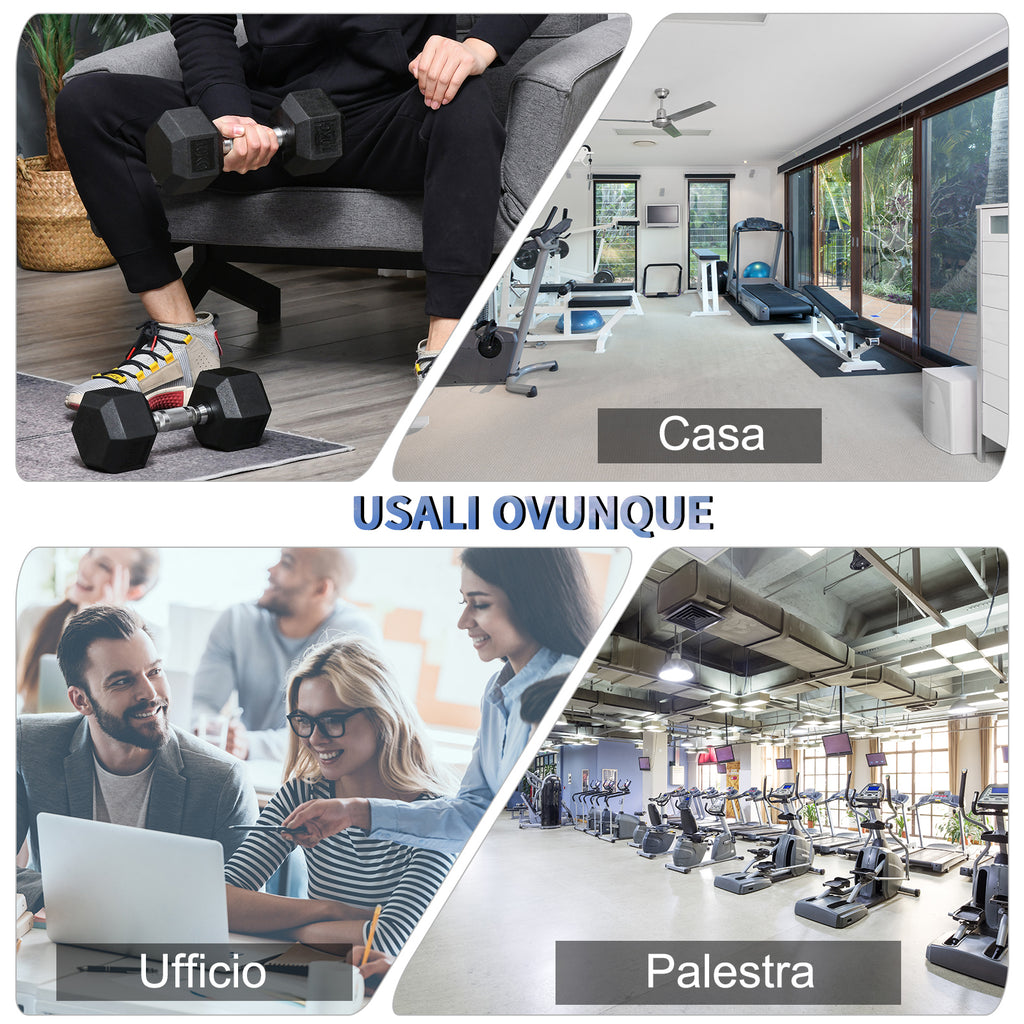 Questa coppia di manubri esagonali rivestiti in gomma è perfetta per il fitness, rendendosi adatta per l'esercizio a casa, in palestra e in ufficio. Ogni peso è infatti costruito in metallo e gomma resistente che non scalfisce il pavimento. La zigrinatura garantisce la sicurezza quando si esegue il curl alternato con manubri, l'overhead shrug, il tricipite kickback con manubri, ecc. Questi pesi rappresentano un modo ideale per fare tanti esercizi di routine con dei semplici manubri.