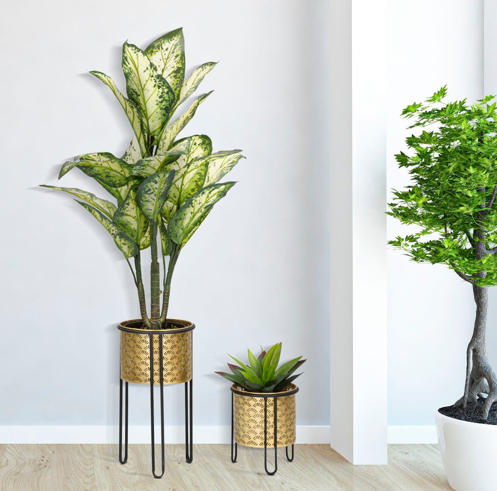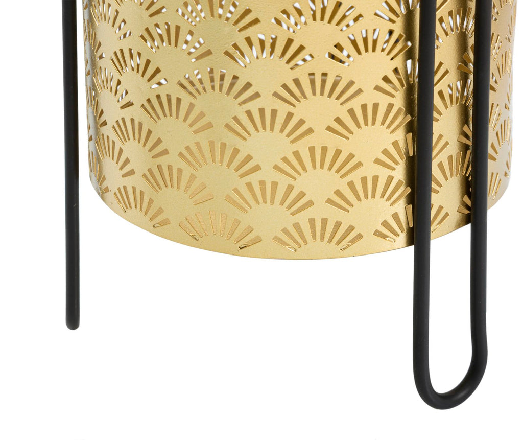 Coppia di portavasi rotondi in metallo dorato con intagli, completi di piedistallo in metallo nero. Il portavasi è removibile.