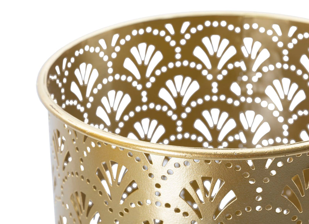 Coppia di portavasi rotondi in metallo dorato con intagli, completi di piedistallo. Il portavasi è removibile.